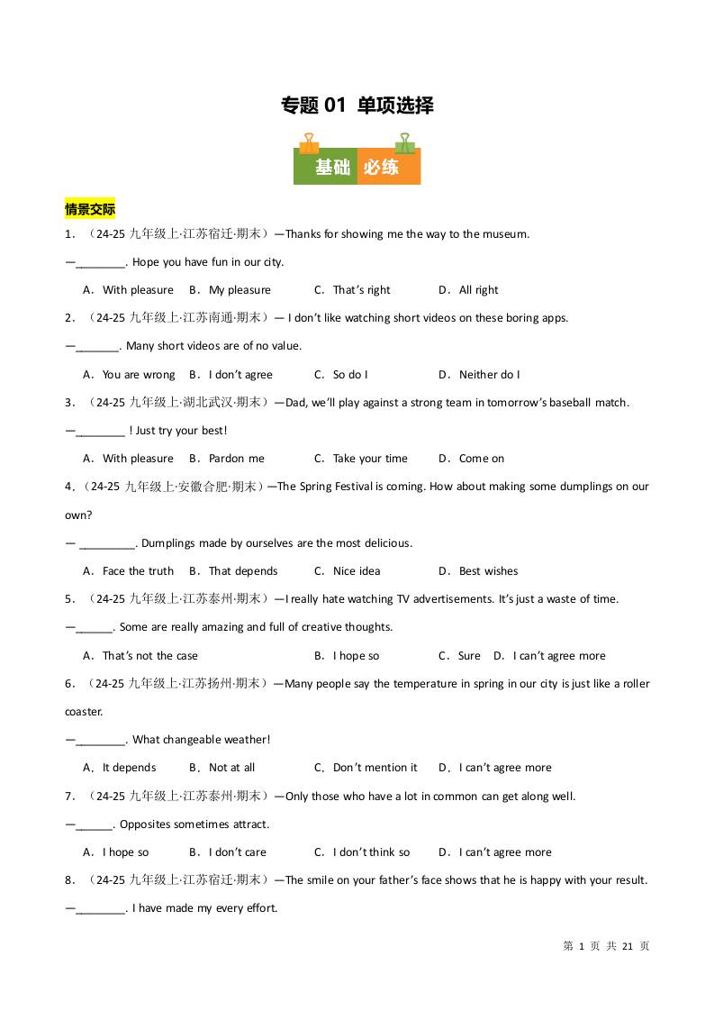 九上英语人教专题01 单项选择(期末真题汇编)(原卷版)