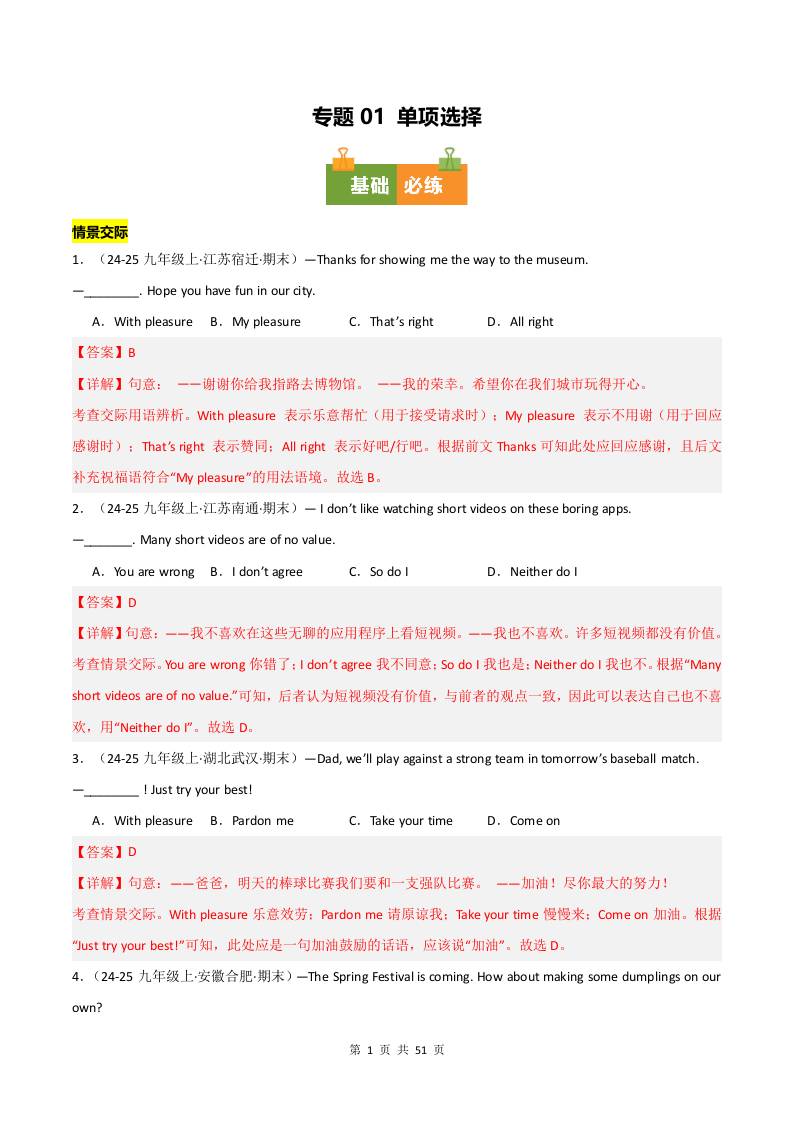 九上英语人教专题01 单项选择(期末真题汇编)(解析版)
