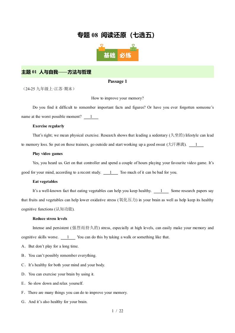 九上英语人教专题08 阅读还原(七选五)(期末真题汇编)(原卷版)