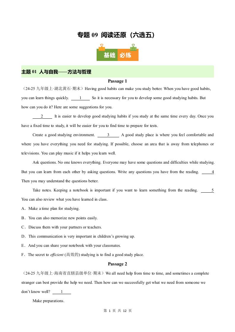 九上英语人教专题09 阅读还原(六选五)(期末真题汇编)(原卷版)