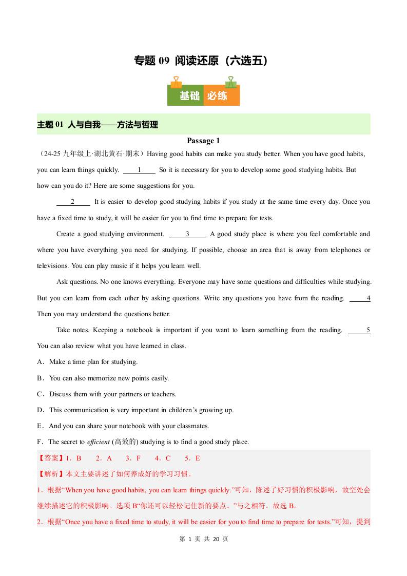 九上英语人教专题09 阅读还原(六选五)(期末真题汇编)(解析版)
