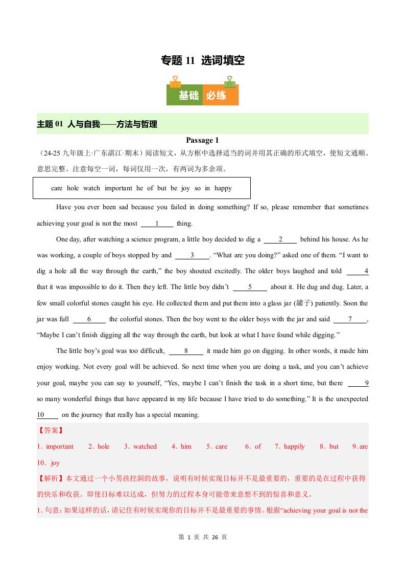 九上英语人教专题11 选词填空(期末真题汇编)(解析版)