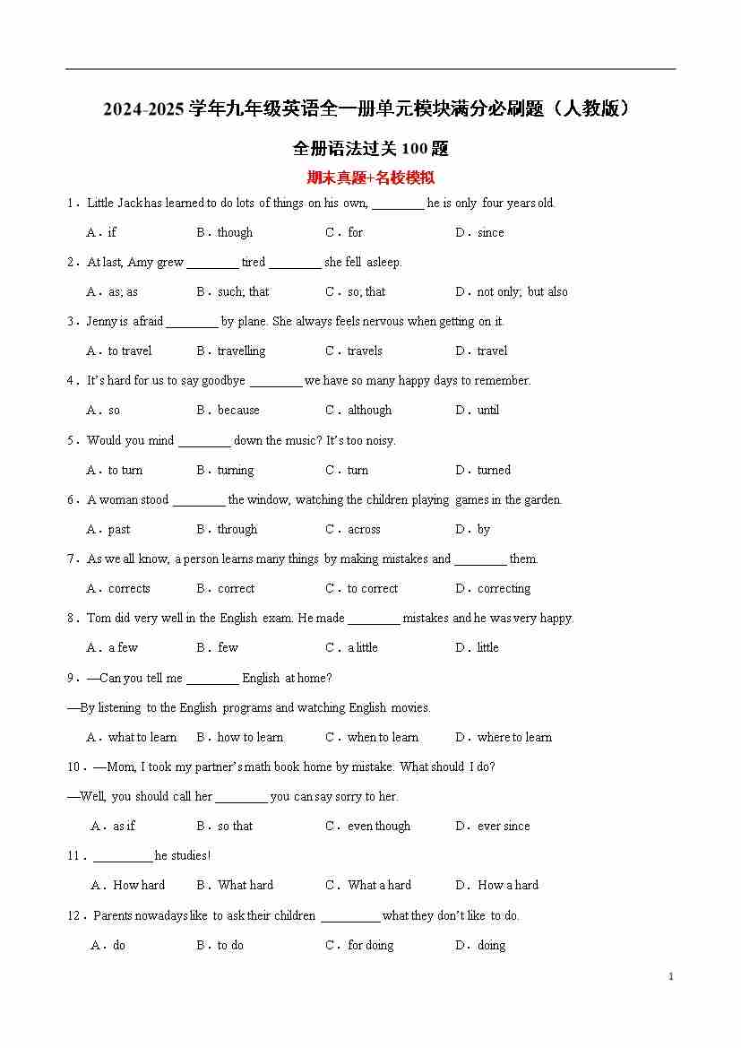 全册语法过关100题(原卷版)-2024-2025学年九年级英语全一册单元模块满分必刷题(人教版)