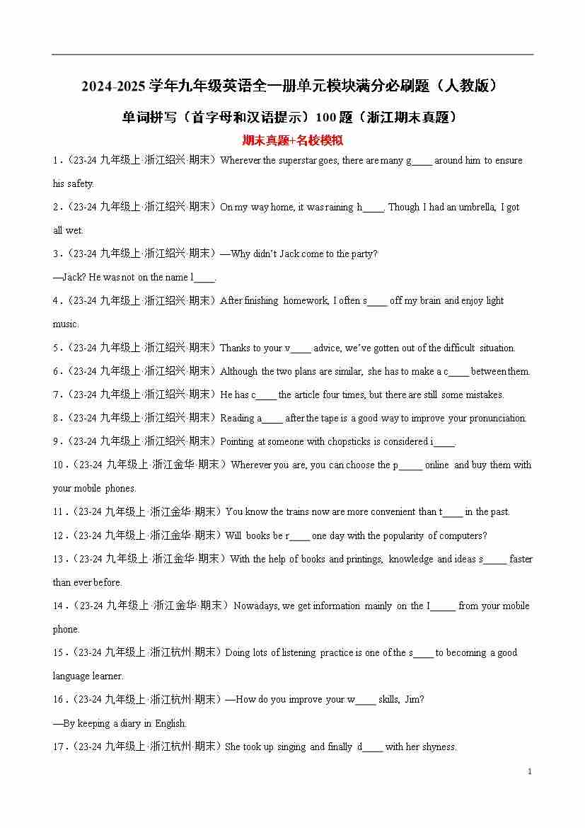 单词拼写(首字母和汉语提示)100题(浙江期末真题)(原卷版)-2024-2025学年九年级英语全一册单元模块满分必刷题(人教版)