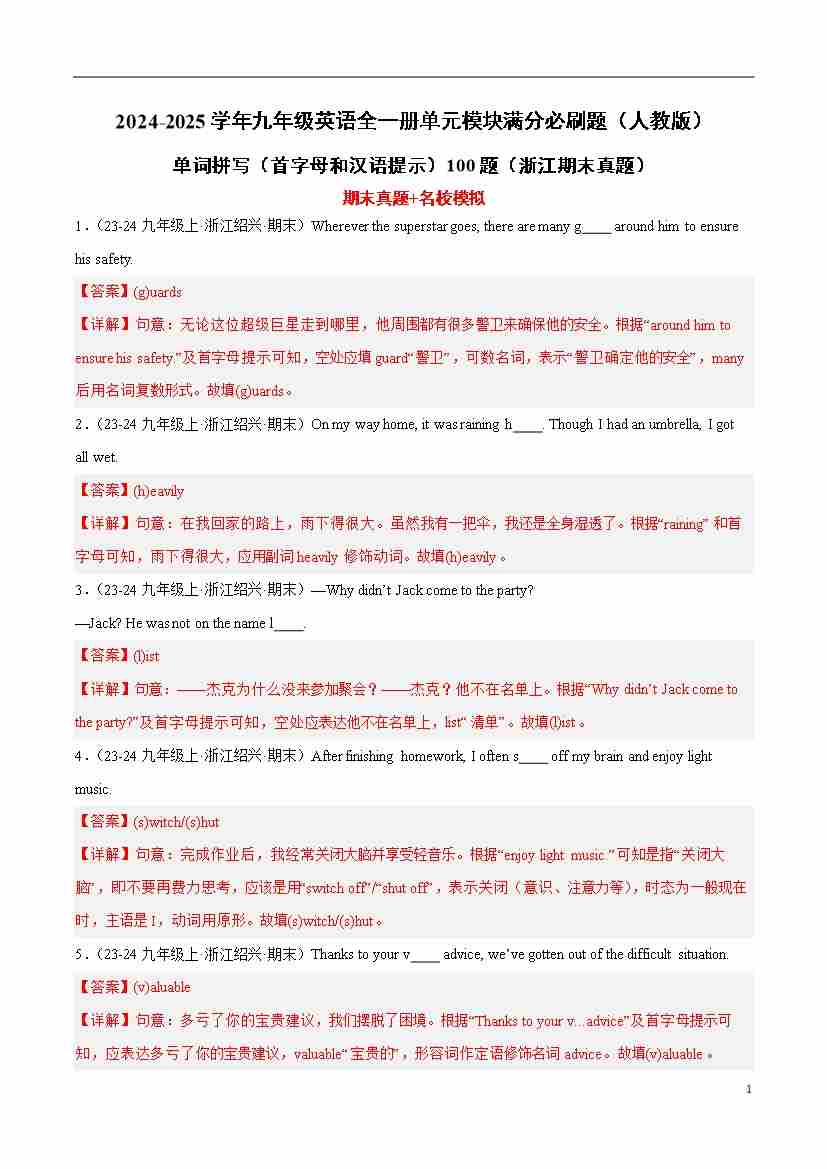 单词拼写(首字母和汉语提示)100题(浙江期末真题)(解析版)-2024-2025学年九年级英语全一册单元模块满分必刷题(人教版)