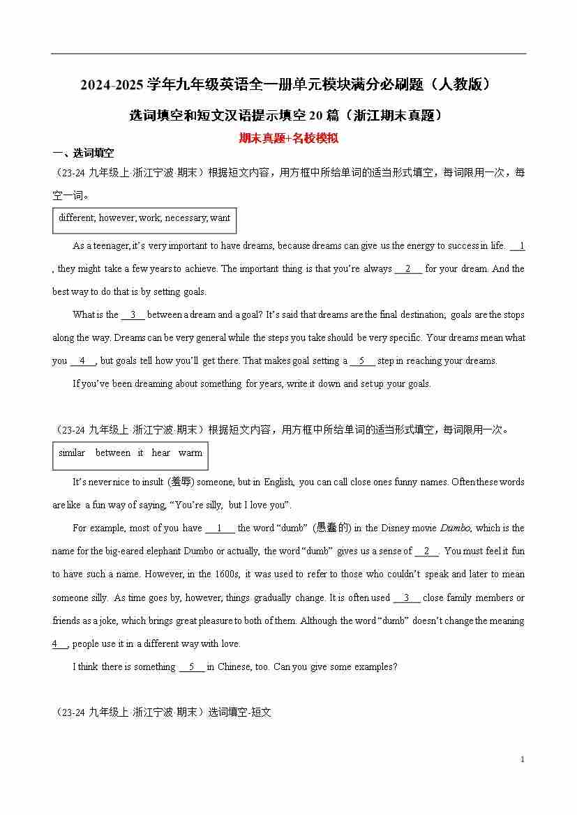 选词填空和短文汉语提示填空20篇(浙江期末真题)(原卷版)-2024-2025学年九年级英语全一册单元模块满分必刷题(人教版)