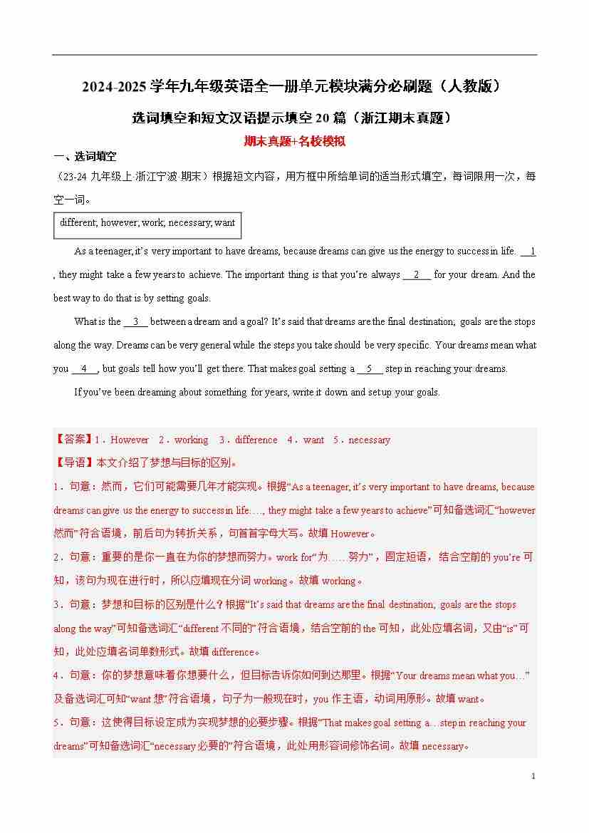 选词填空和短文汉语提示填空20篇(浙江期末真题)(解析版)-2024-2025学年九年级英语全一册单元模块满分必刷题(人教版)