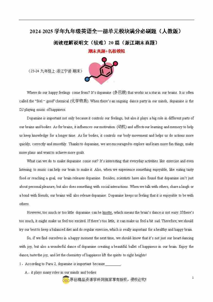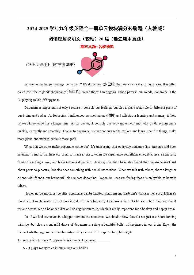 阅读理解说明文(较难)20篇(浙江期末真题)(原卷版)-2024-2025学年九年级英语全一册单元模块满分必刷题(人教版)