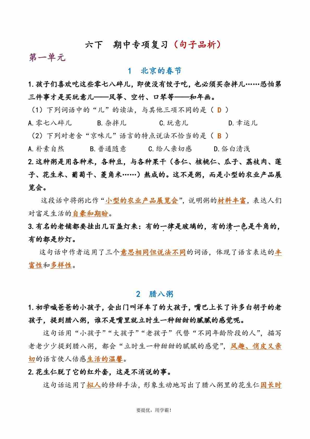 【期中专项复习(句子品析)】六下语文