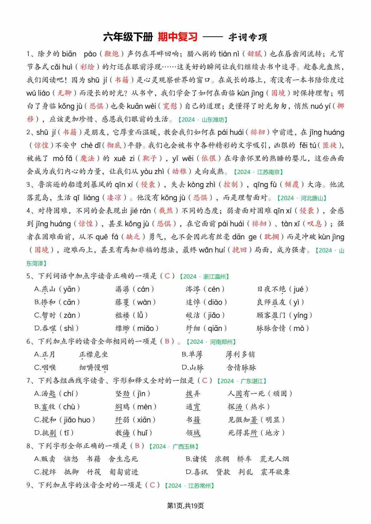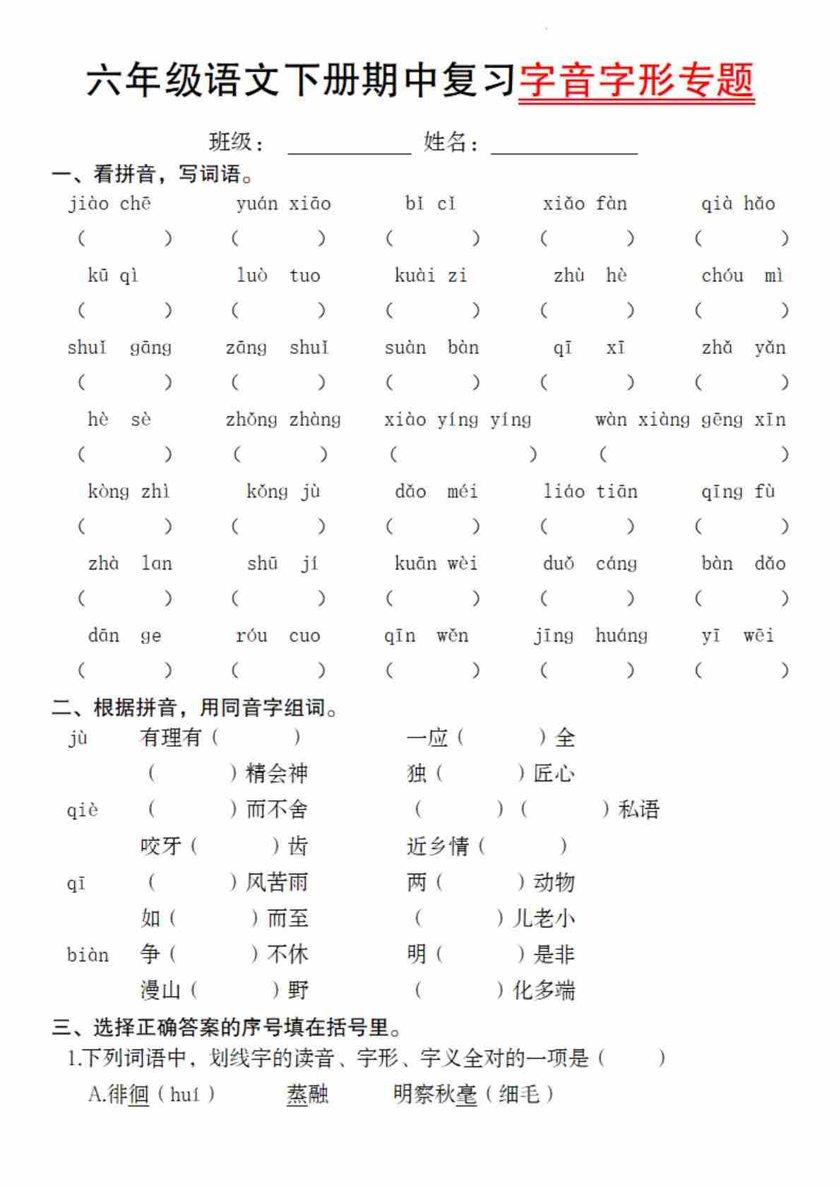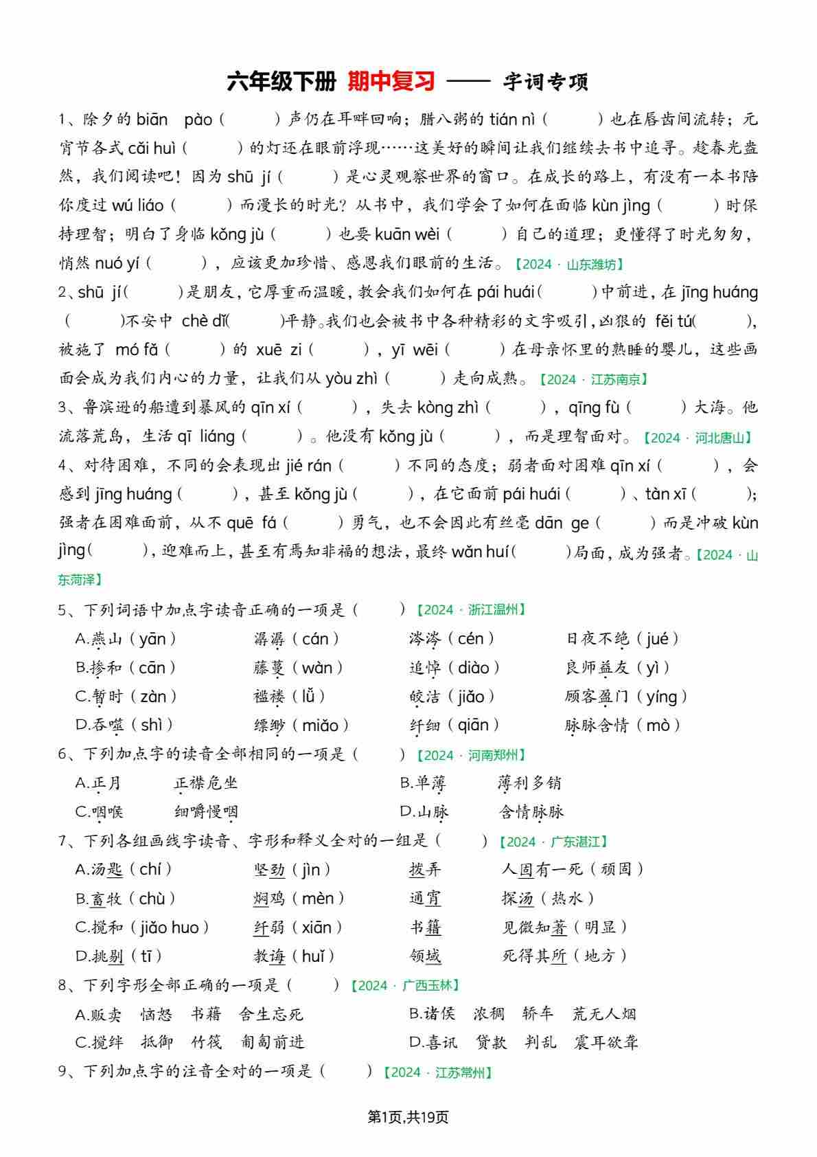 【期中复习专题01:字音字形】六下语文