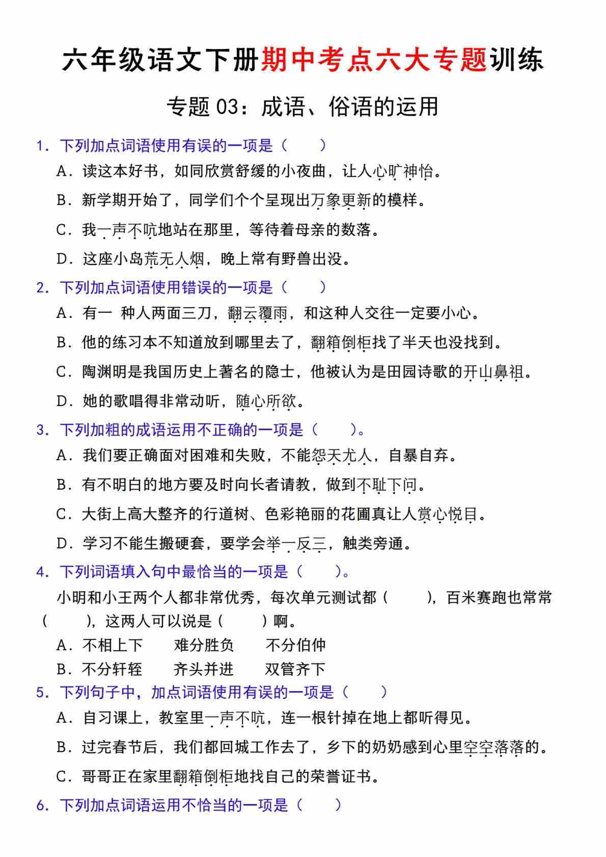 【期中复习专题03:成语、俗语的运用】六下语文