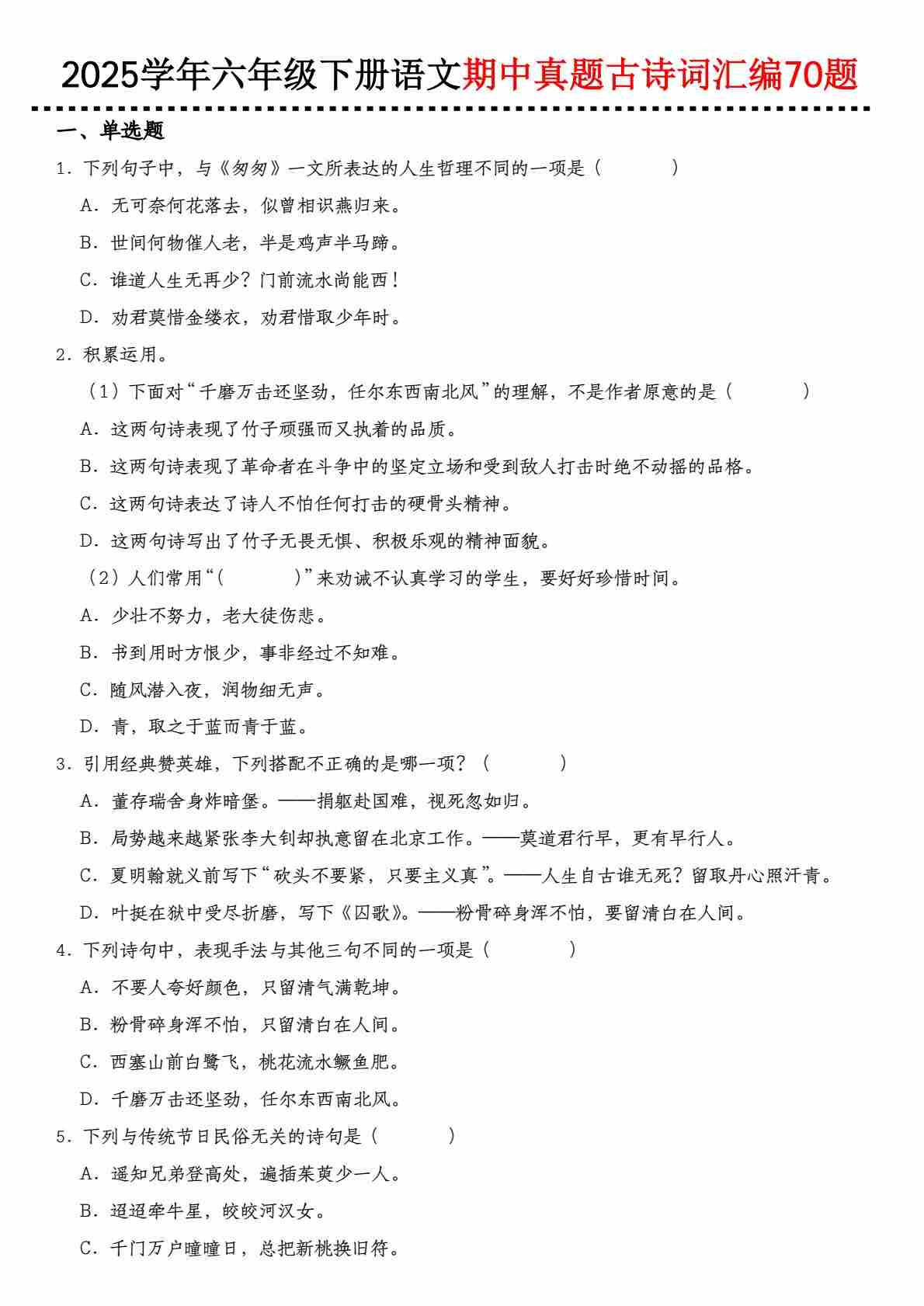 【期中真题古诗词汇编】六下语文