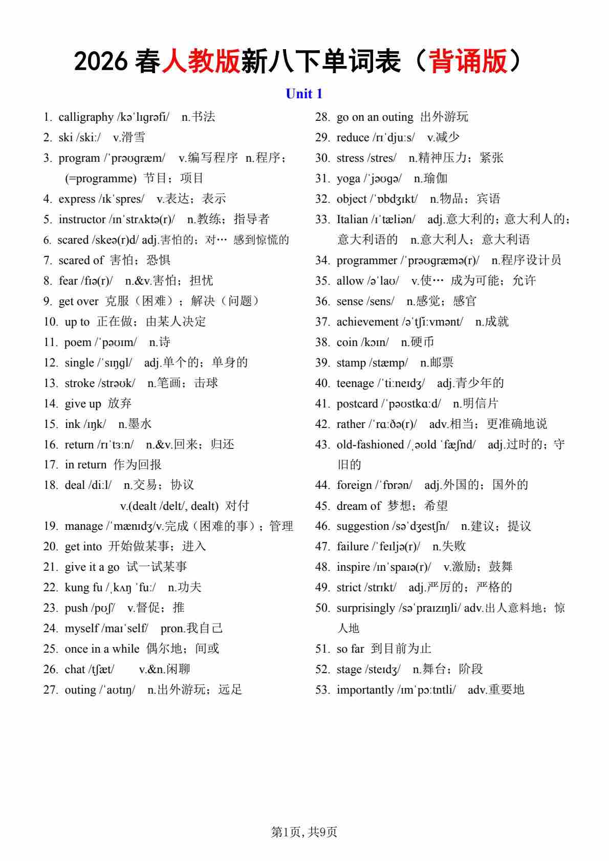 2026春人教版八下单词表 (背诵版)