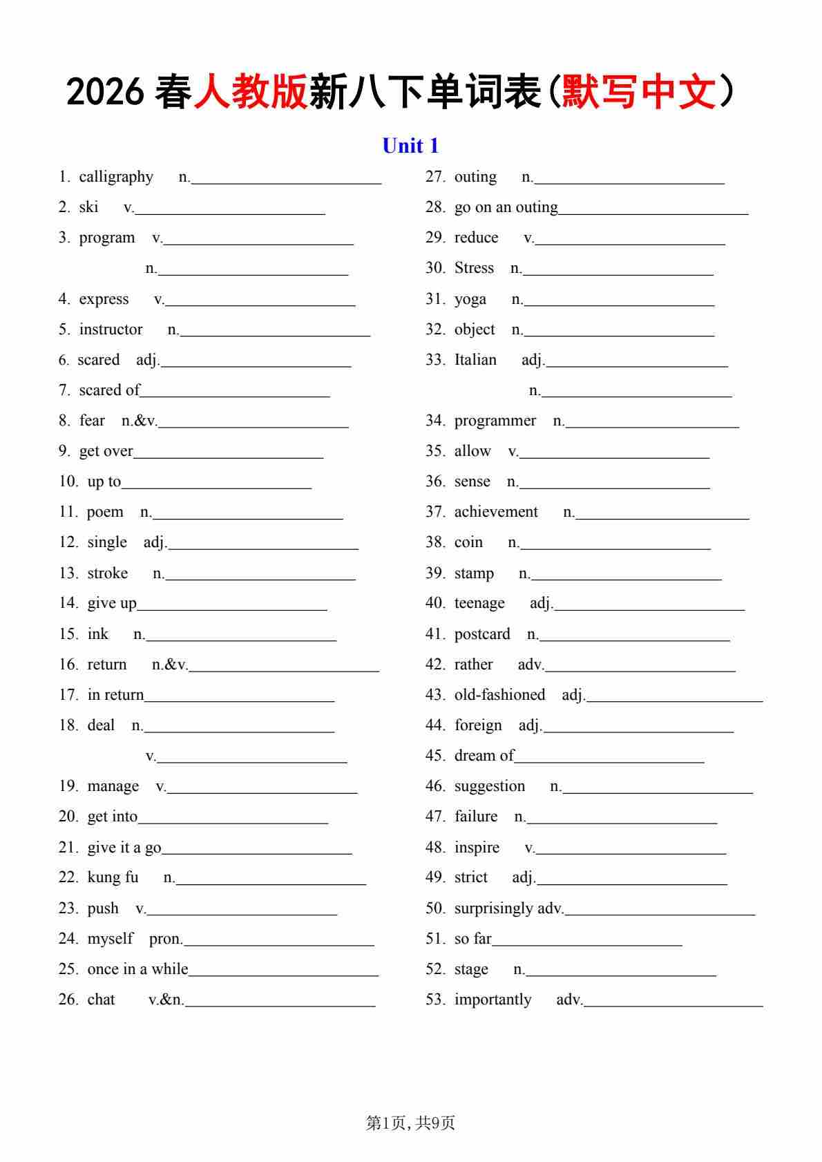 2026春人教版八下单词表(默写中文)
