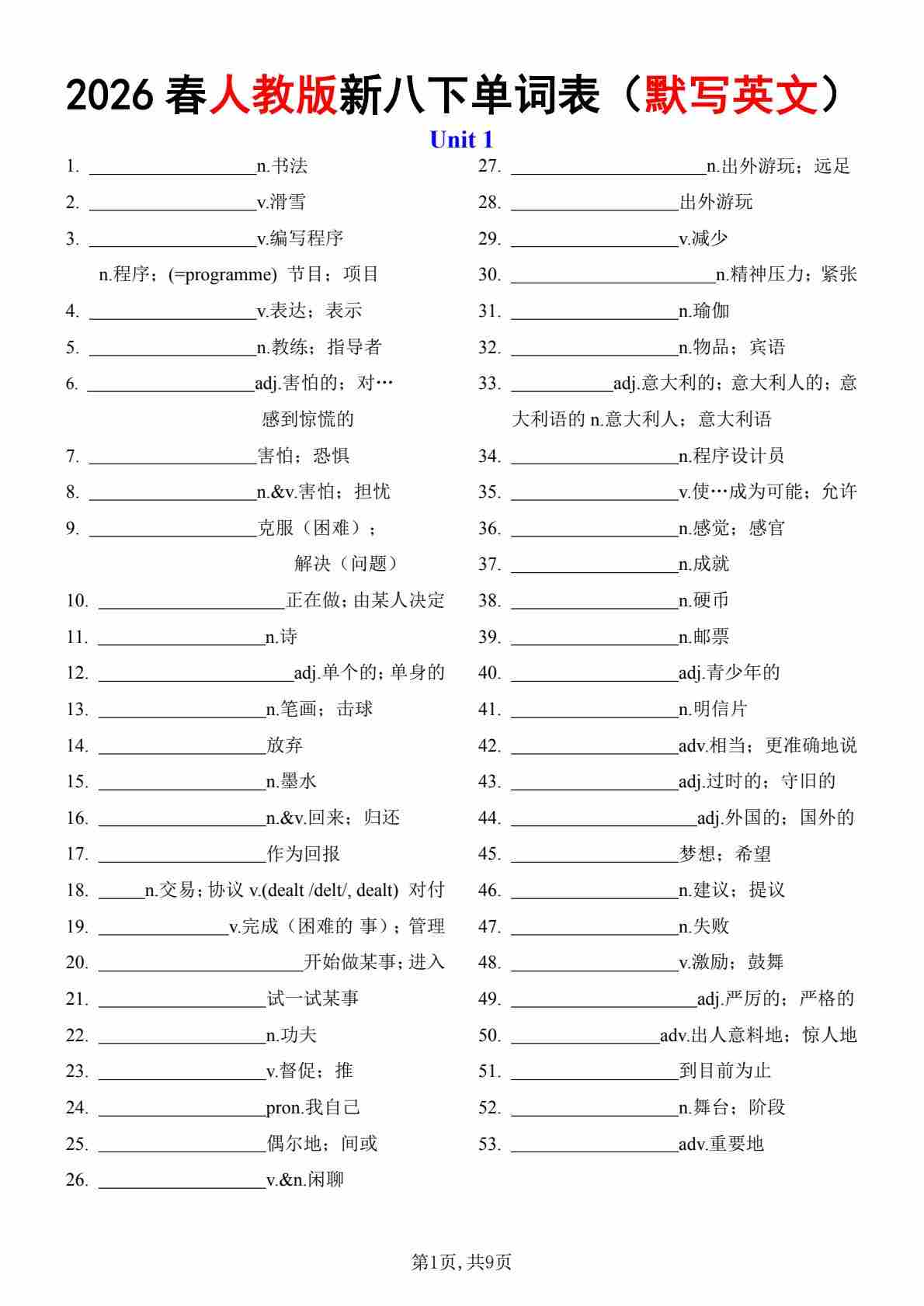 2026春人教版八下单词表(默写英文)