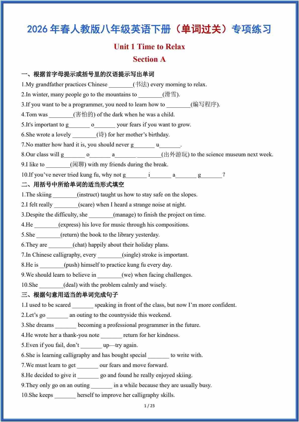 2026春人教版新八下重点短语及固定搭配-(默写中文)1