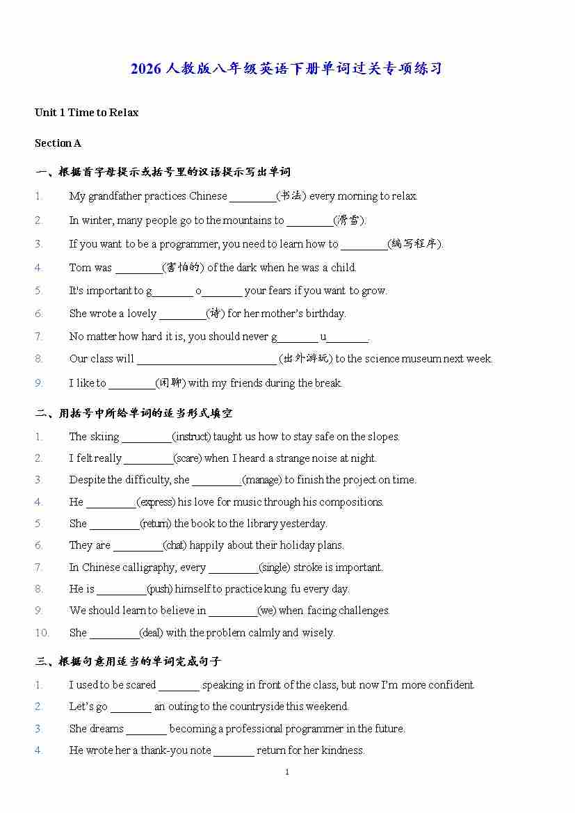 2026年春人教版八年级英语下册(单词过关)专项练习含答案