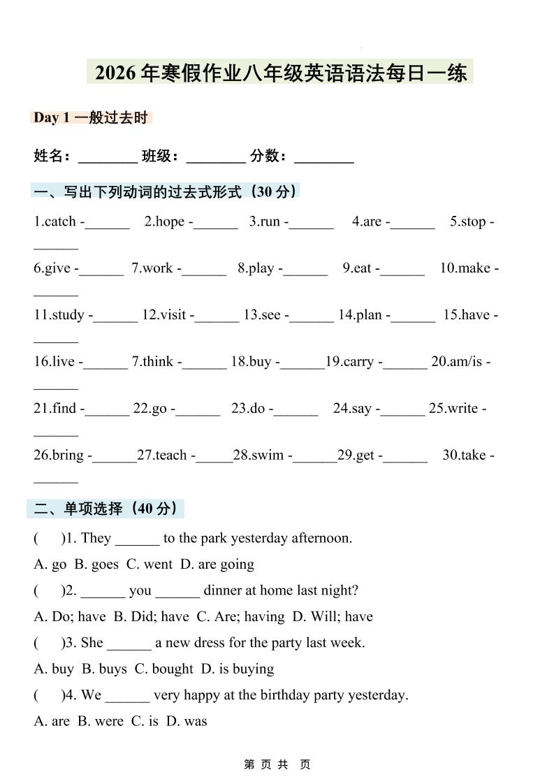 26年寒假人教版英语八年级语法寒假作业 每日一练(含答案)(4)-复制