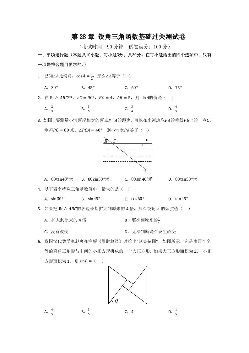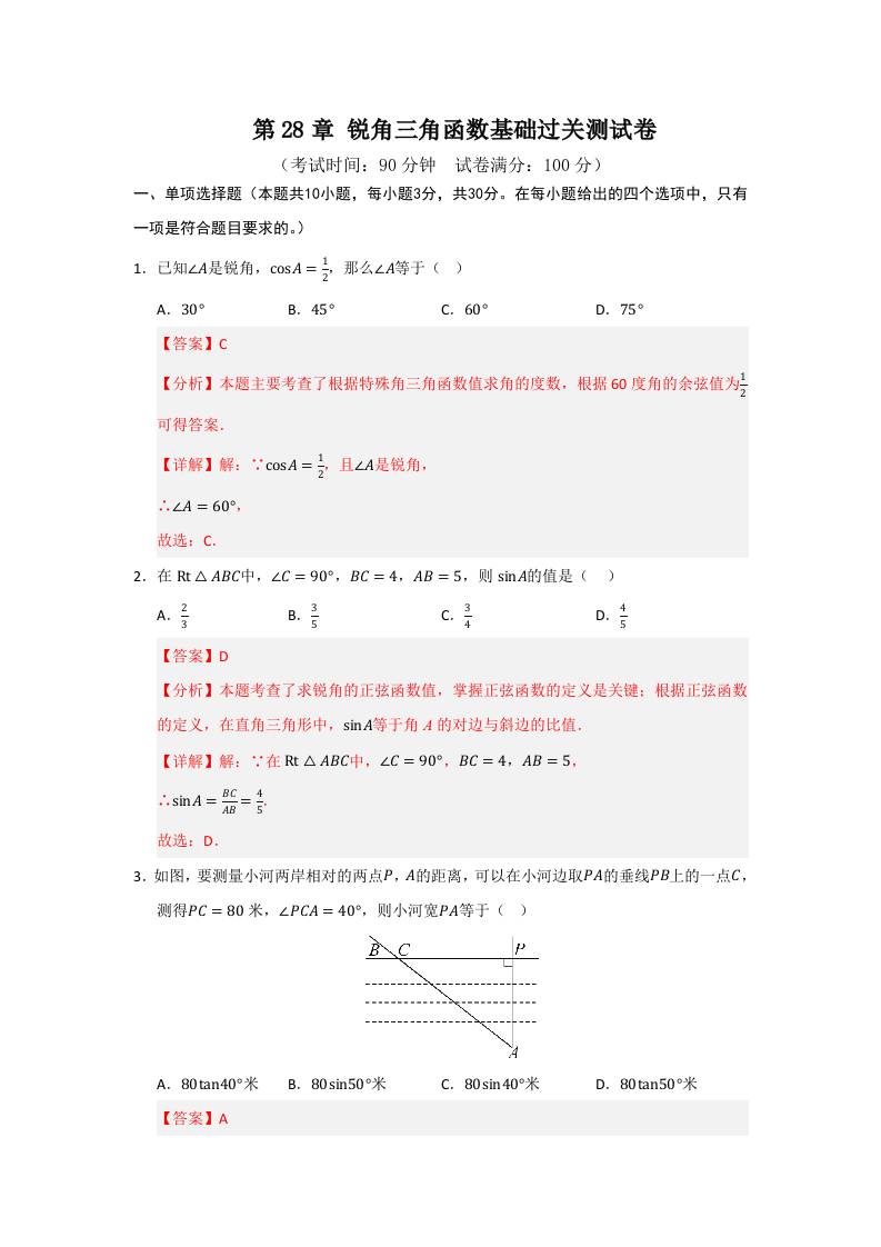 第28章 锐角三角函数基础过关测试卷(解析版)