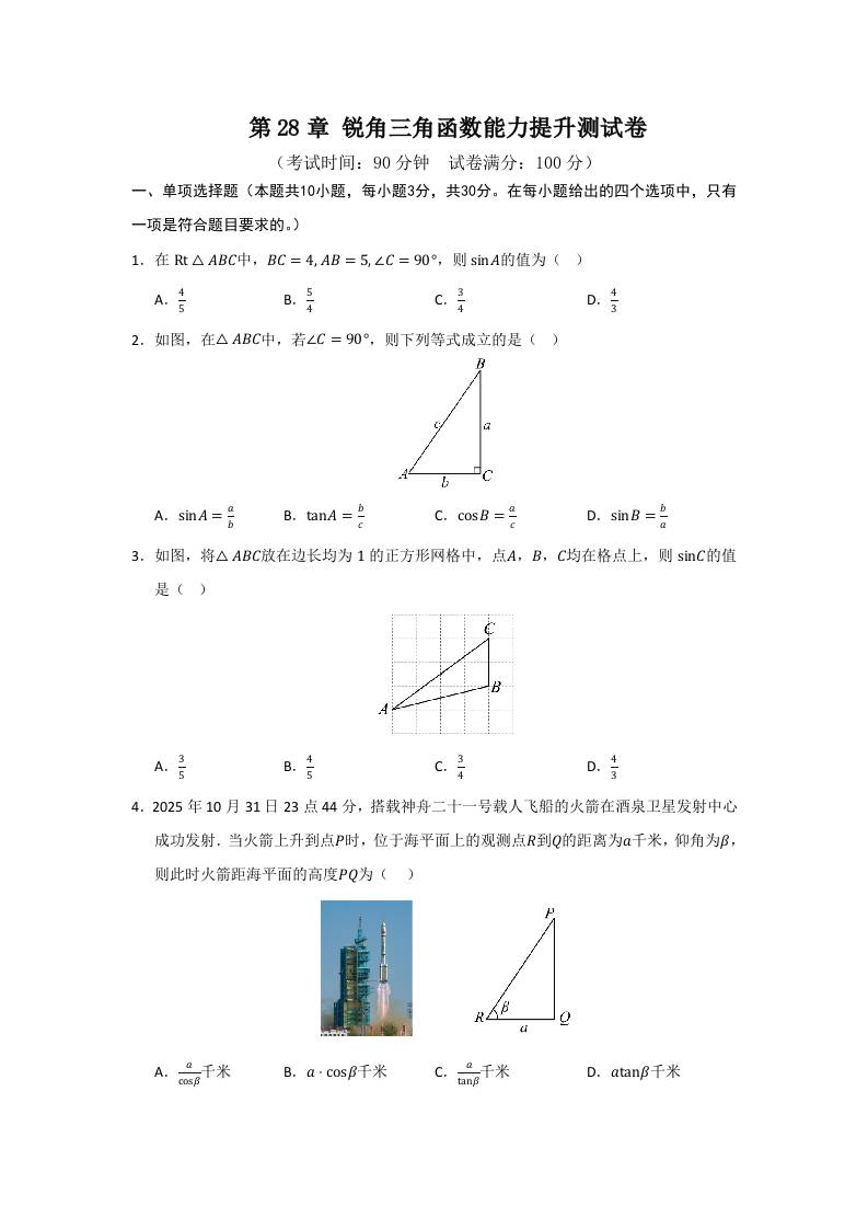 第28章 锐角三角函数能力提升测试卷(考试版)