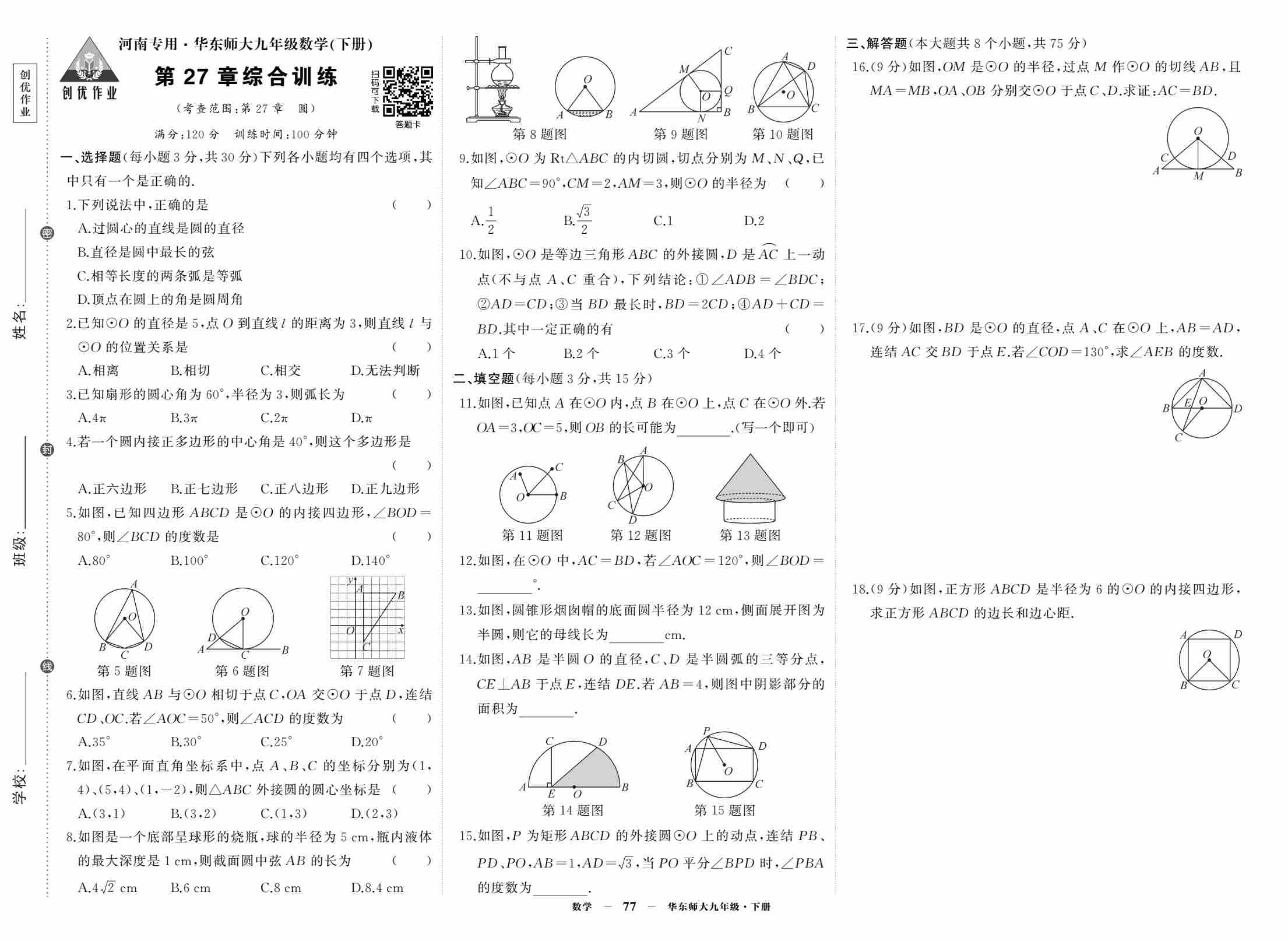 九下数学第27章圆测试(考试版A4)