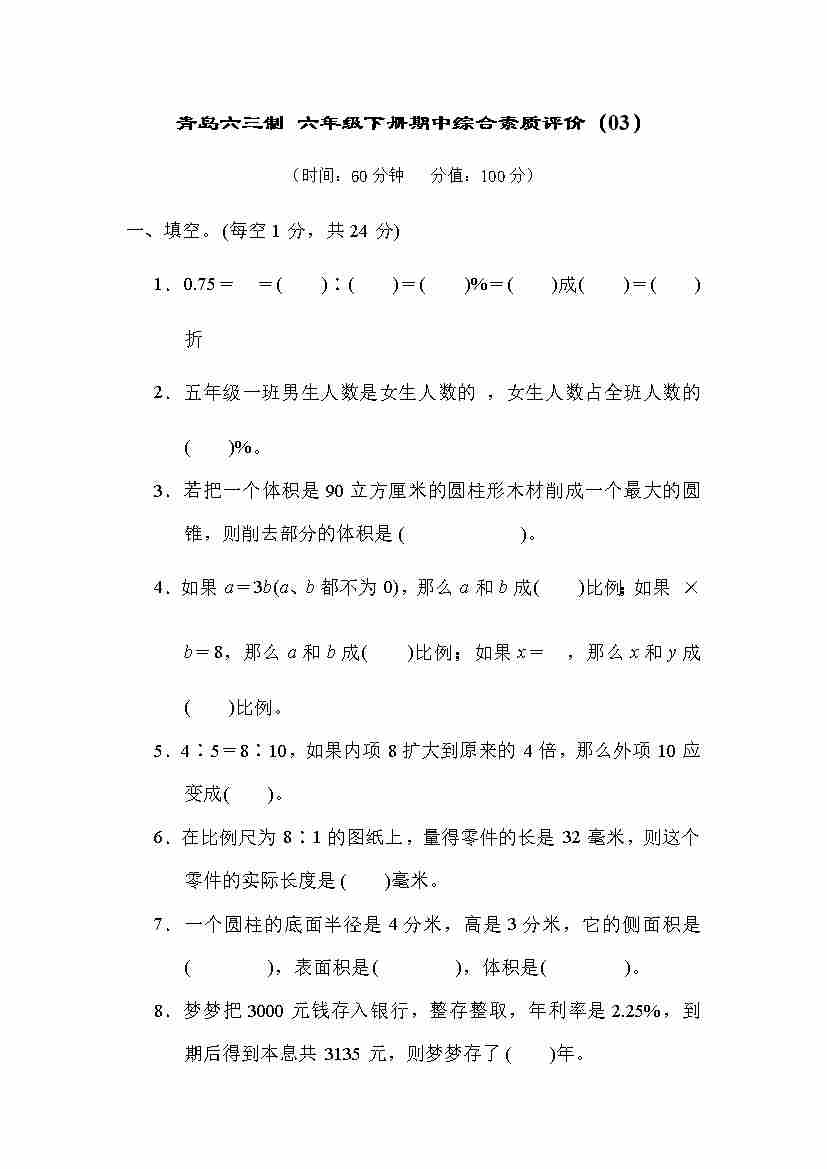 【满分冲刺】期中综合测试卷(03)青岛63版六年级数学下册(含答案)