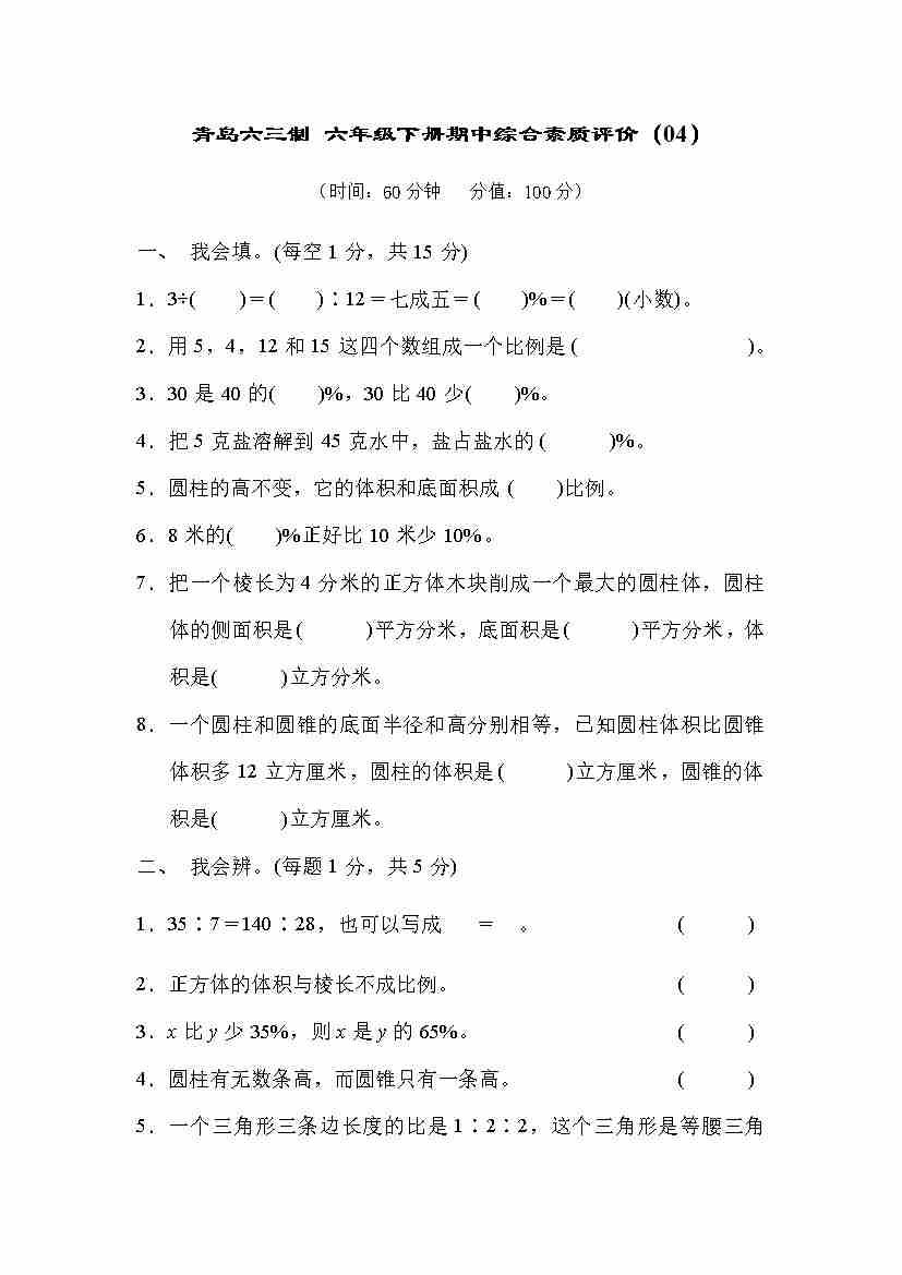 【满分冲刺】期中综合测试卷(04)青岛63版六年级数学下册(含答案)