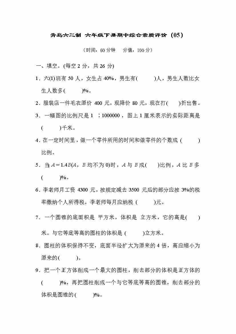 【满分冲刺】期中综合测试卷(05)青岛63版六年级数学下册(含答案)