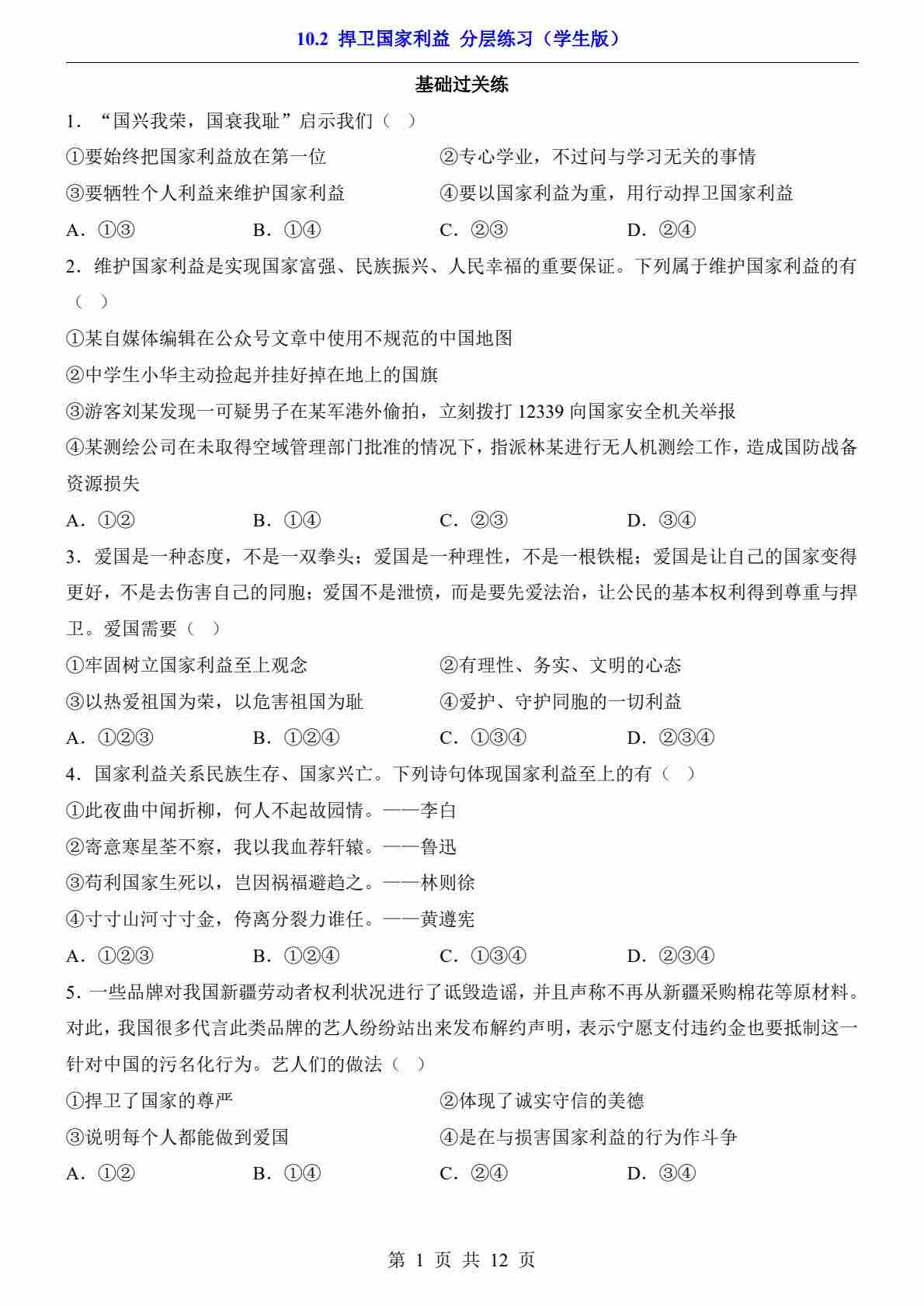 10.2 捍卫国家利益(分层练习)00