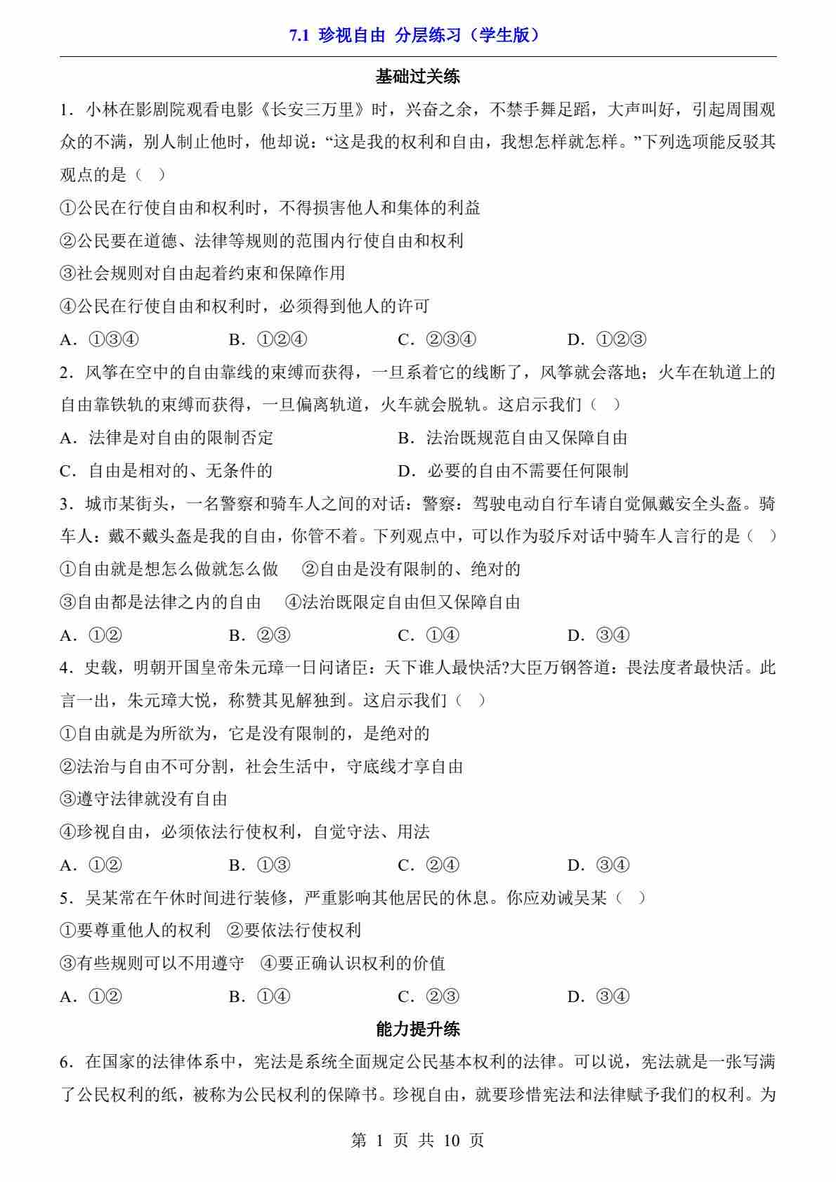 7.1 珍视自由(分层练习)88