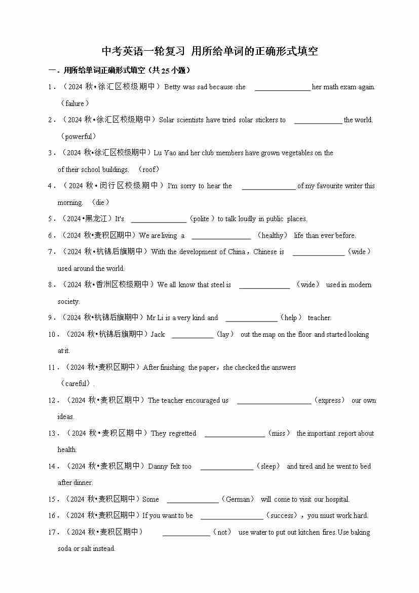 2026年中考英语一轮复习 用所给单词的正确形式填空(含答案解析)