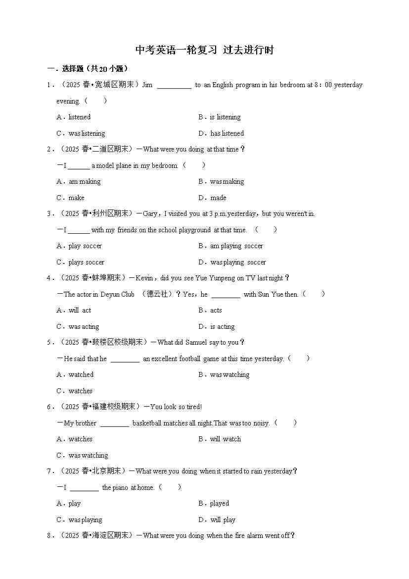 2026年中考英语一轮复习 过去进行时(含答案解析)