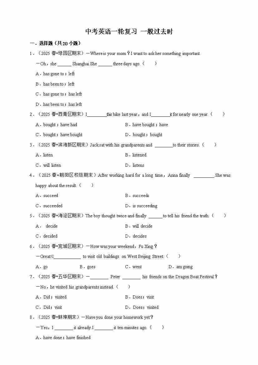 2026年中考英语一轮复习 一般过去时(含答案解析)