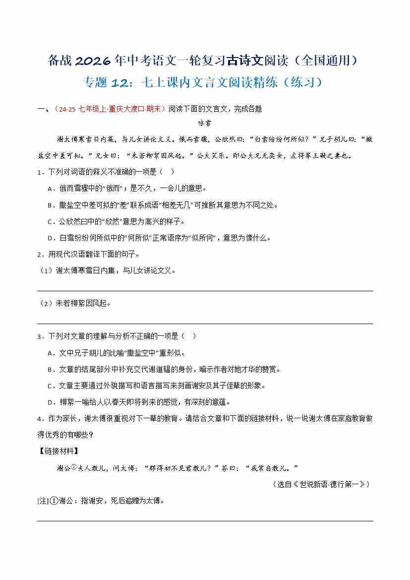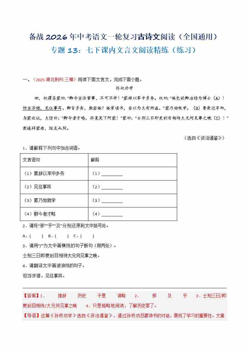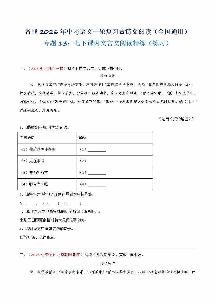 专题13:七下课内文言文阅读精练(练习)原卷版