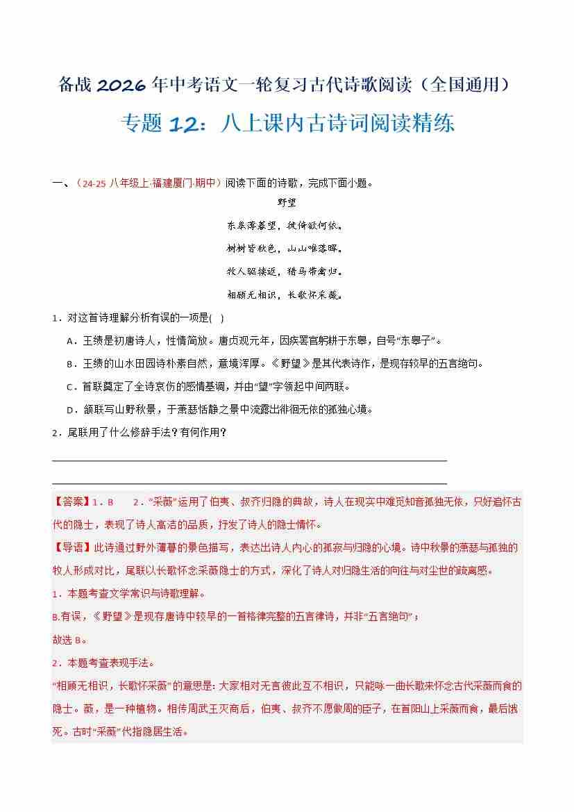 专题15:八下课内文言文阅读精练(练习)原卷版