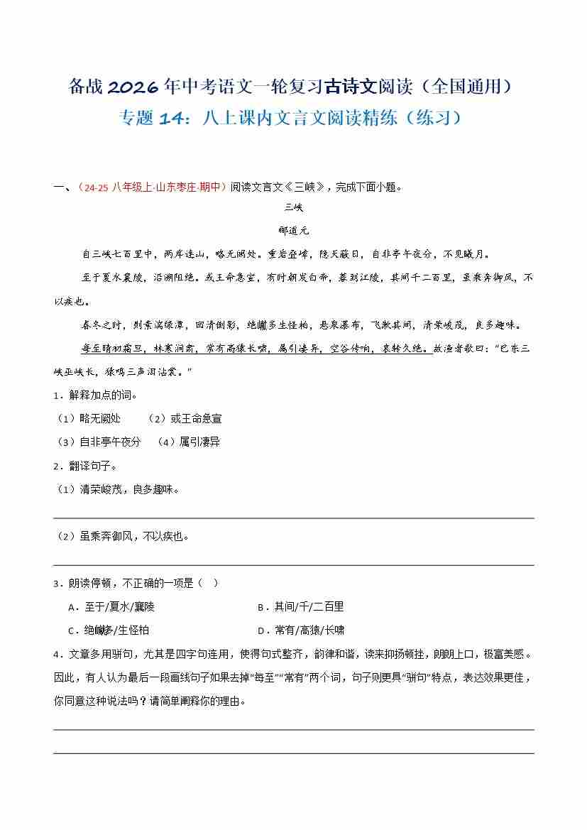 专题14:八上课内文言文阅读精练(练习)原卷版