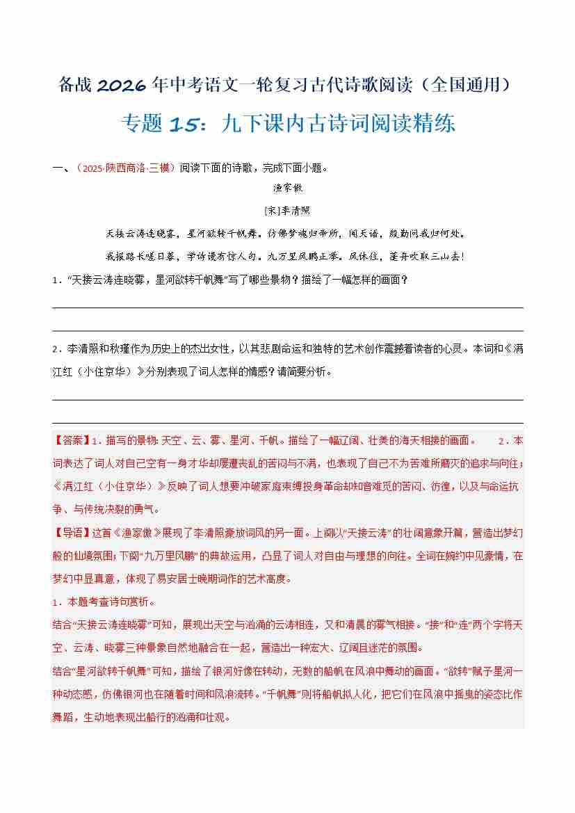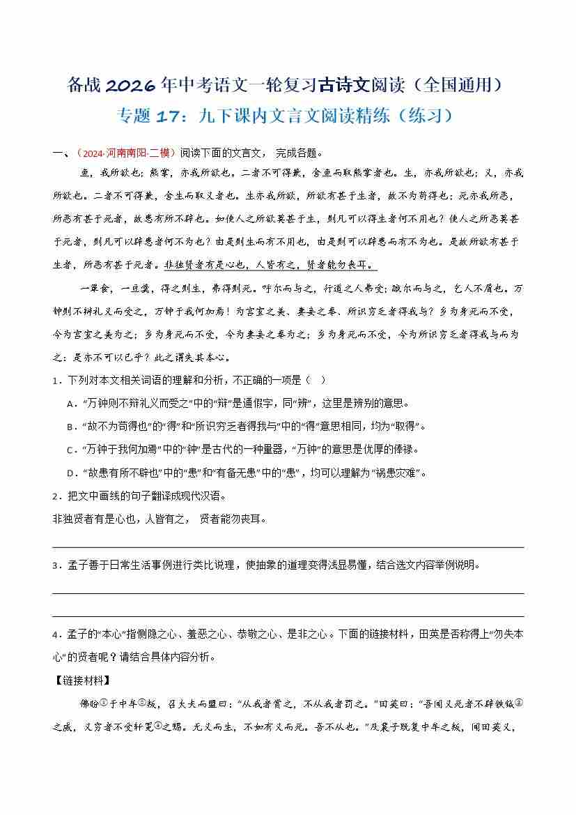 专题17:九下课内文言文阅读精练(练习)原卷版