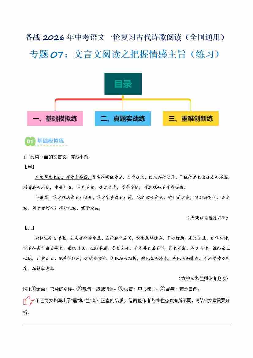 专题07:文言文阅读之把握情感主旨(练习)解析版