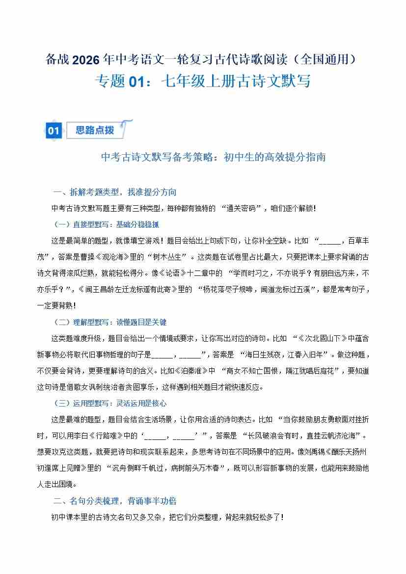 专题01:七年级上册古诗文默写(解析版)