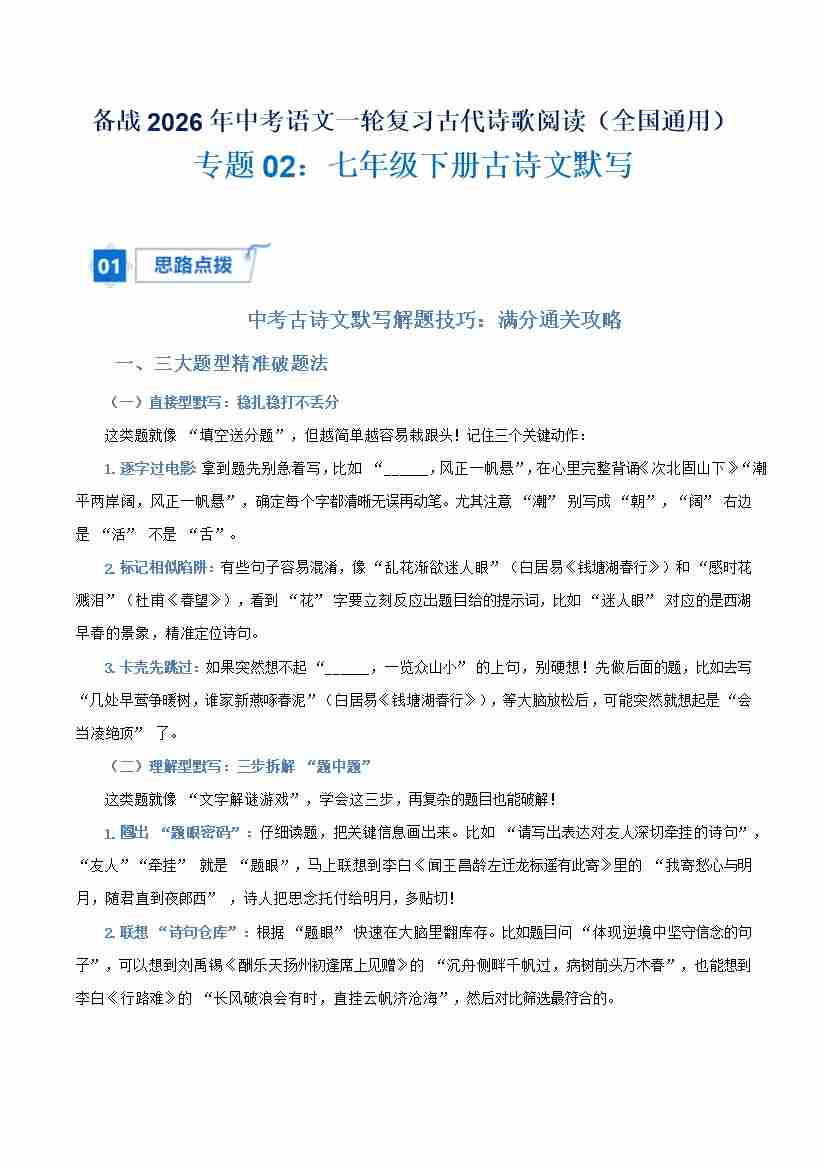 专题02:七年级下册古诗文默写(解析版)