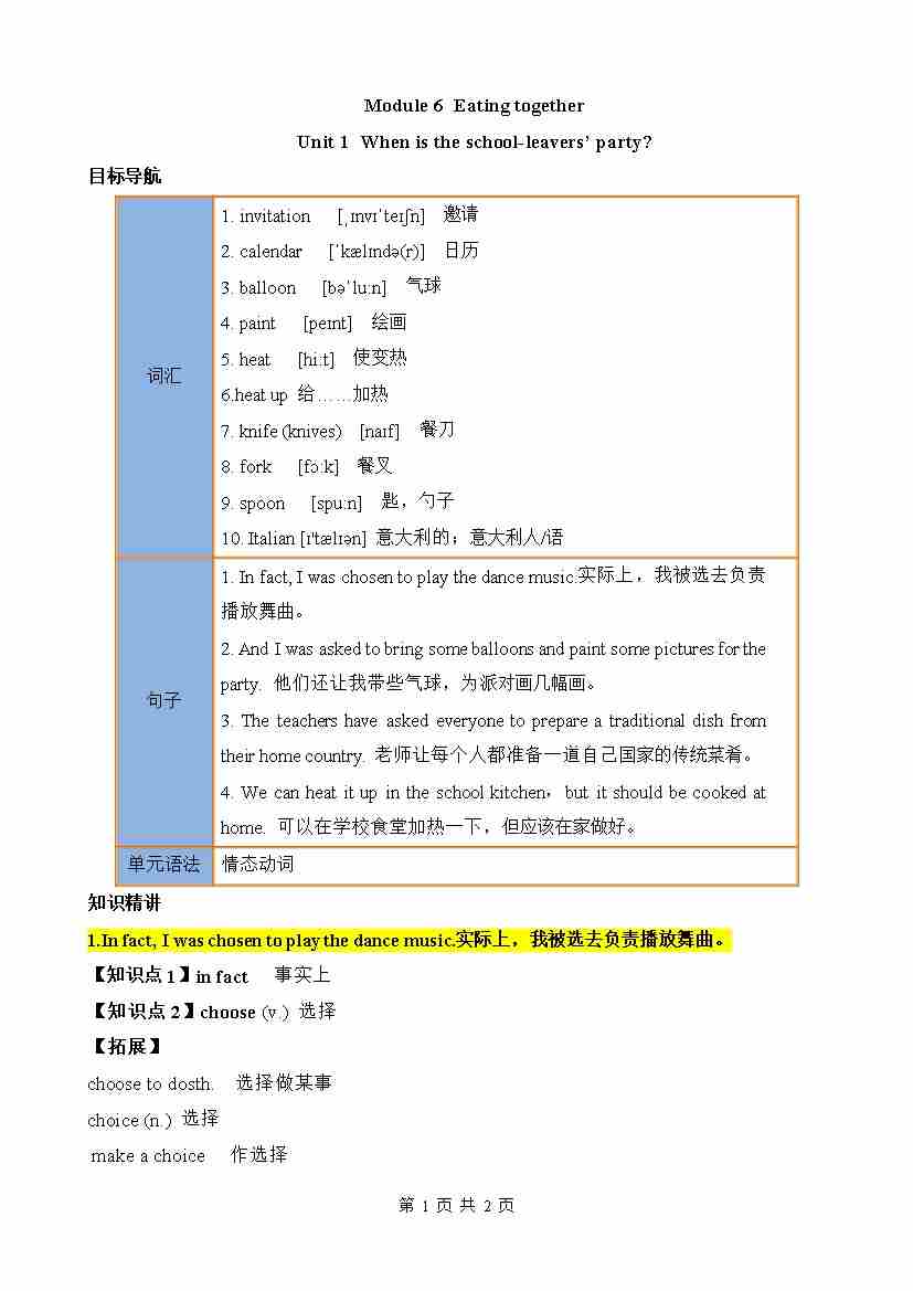 Module 6 Eating together(知识清单)