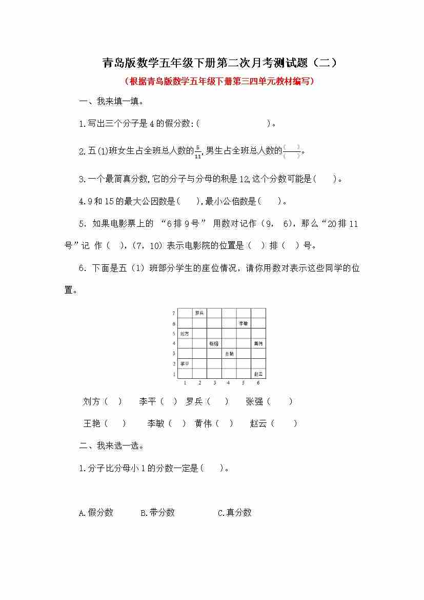 第三四单元月考综合检测(月考)青岛版五年级下册数学