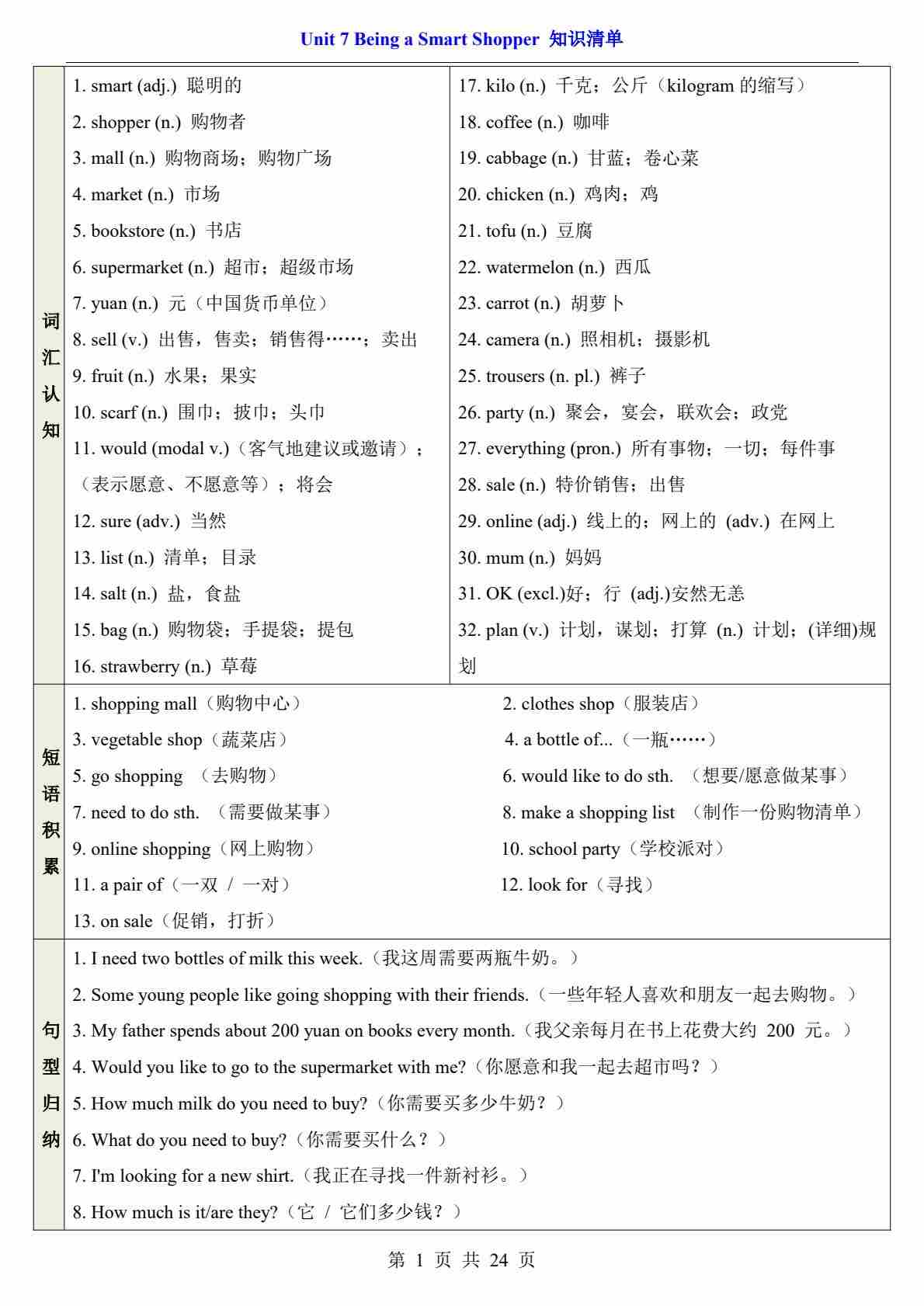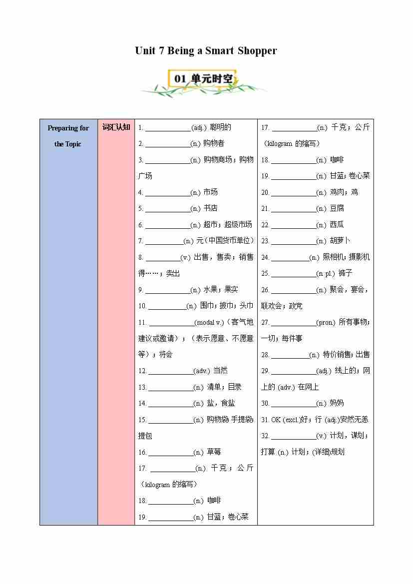 Unit 7 Being a Smart Shopper【速记清单】(原卷版)