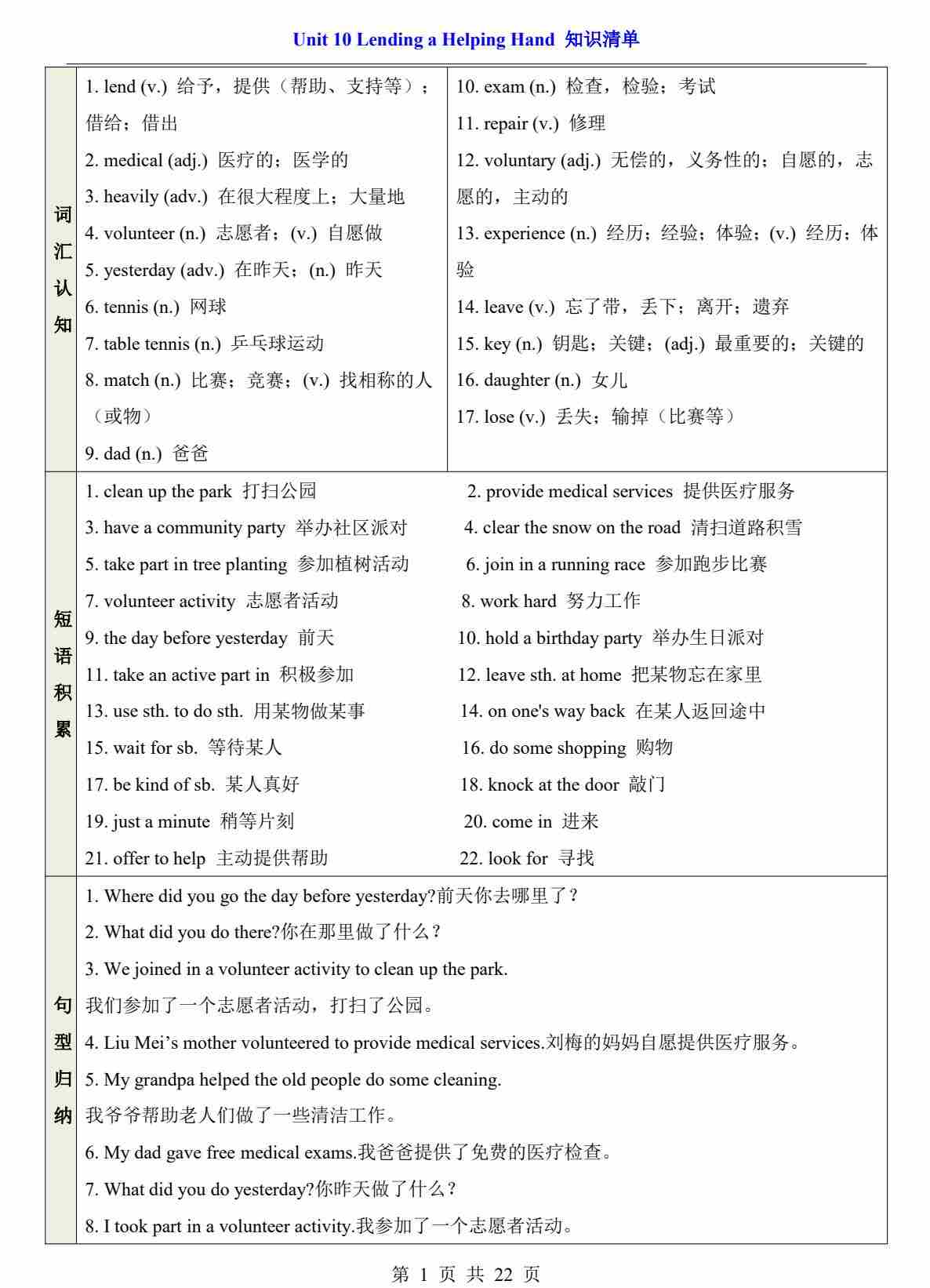 Unit 10 Lending a Helping Hand【速记清单】-2024-2025学年七年级英语下册单元速记•巧练(仁爱版)(原卷版)