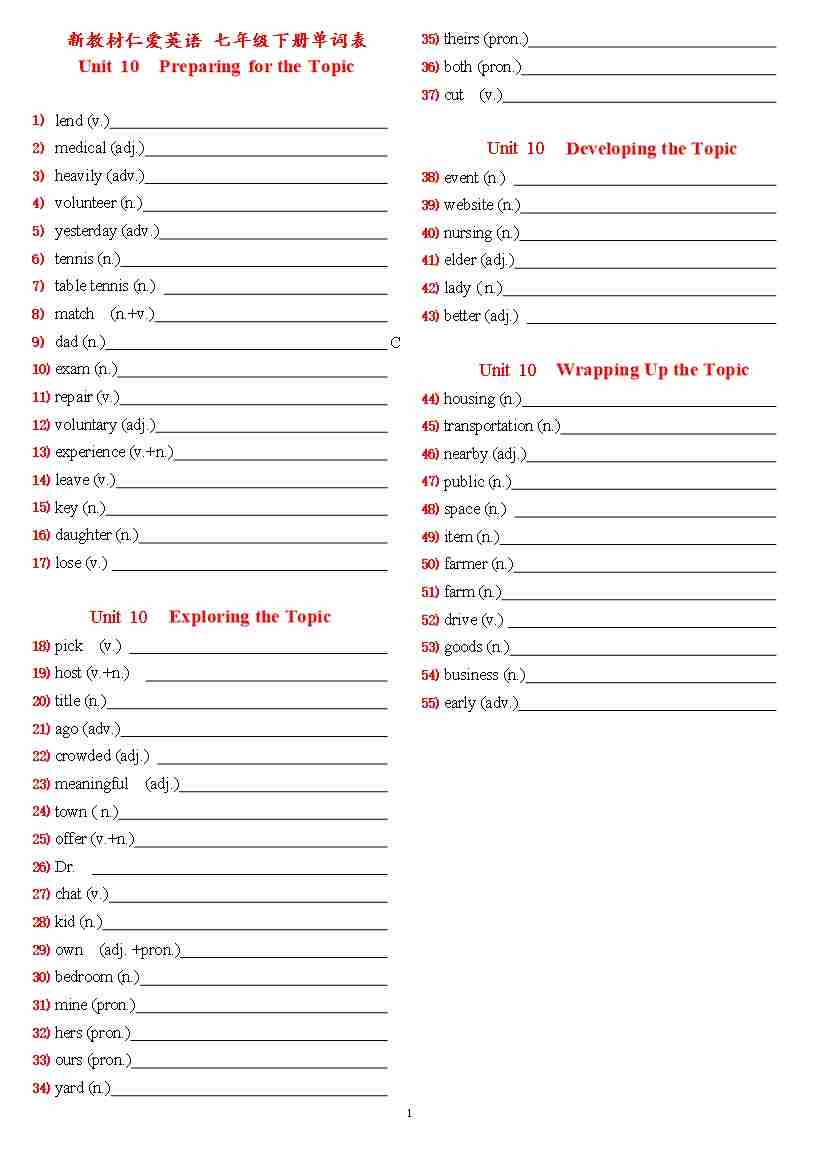 仁爱七下 新版单词表