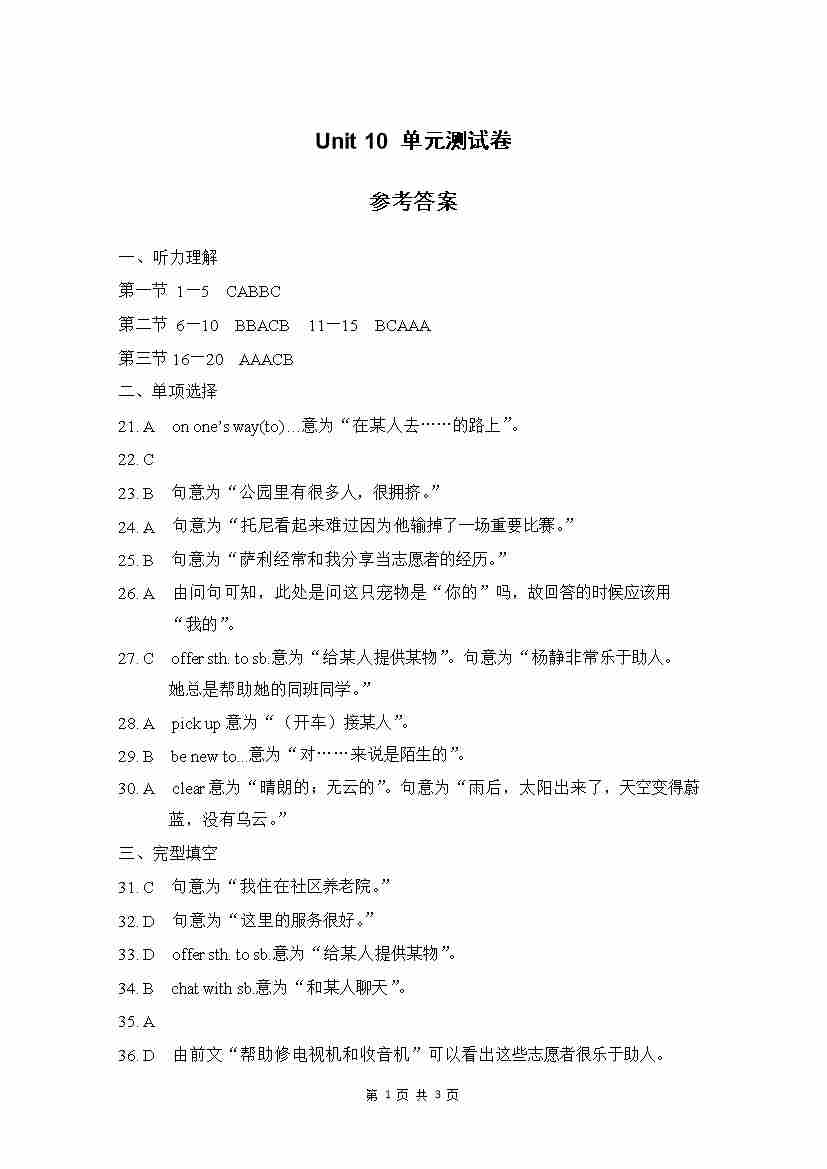 Unit 10 单元测试 参考答案