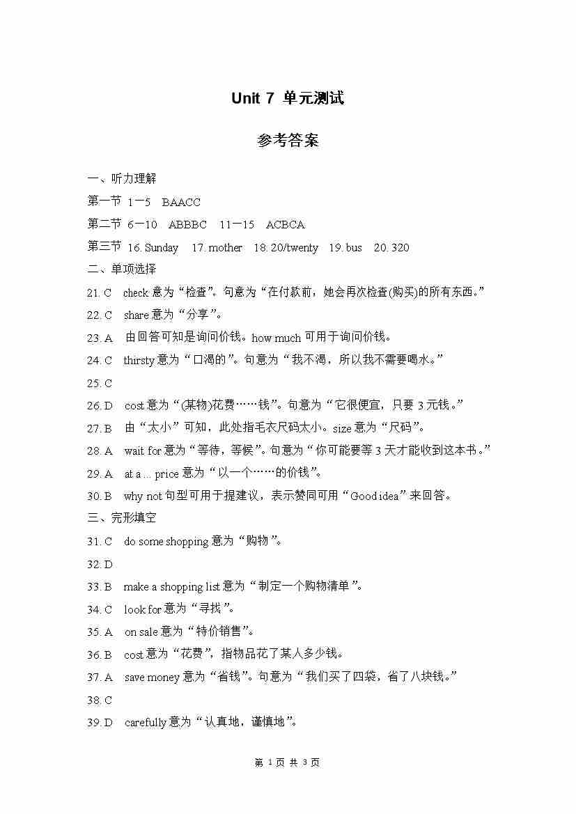 Unit 7 单元测试 参考答案