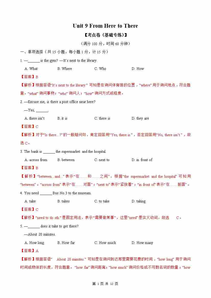 Unit 9 From Here to There【考点卷(基础训练)】(教师版)