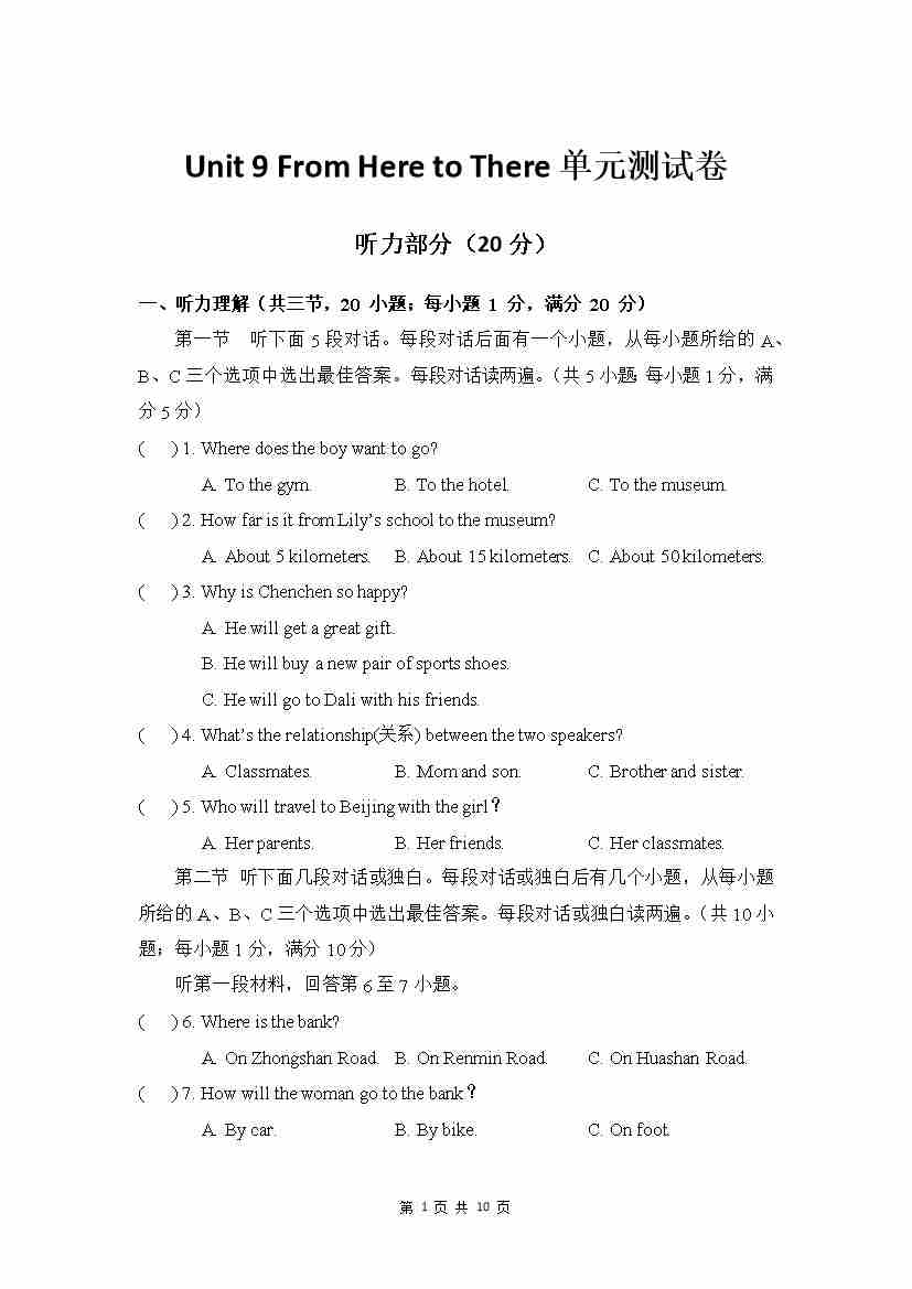 Unit 10 单元测试 试卷
