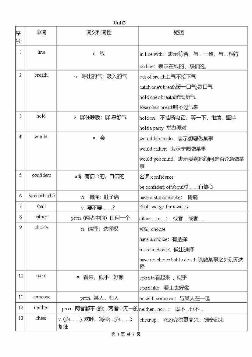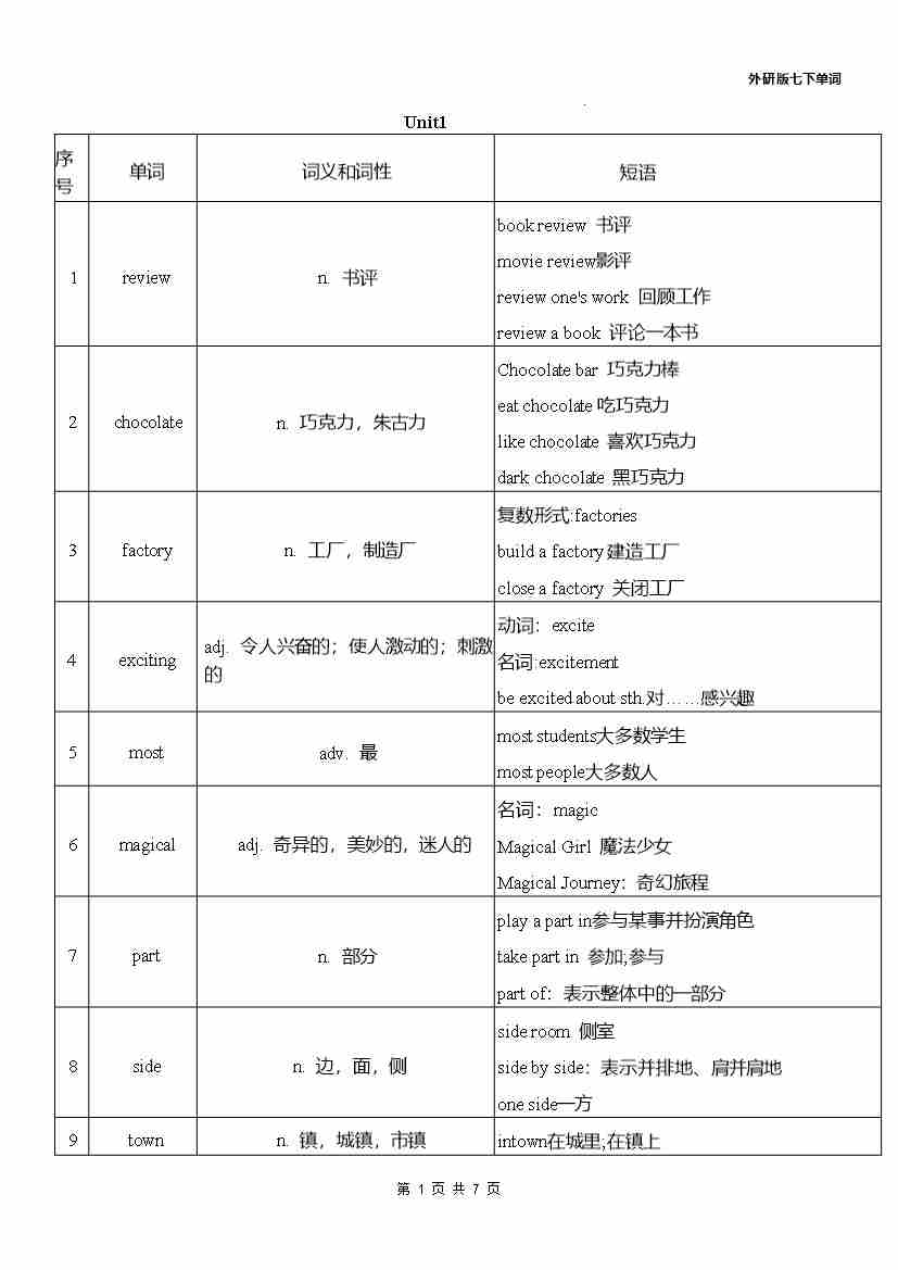2026 春 外研七年级下册单词英译中(改版)word